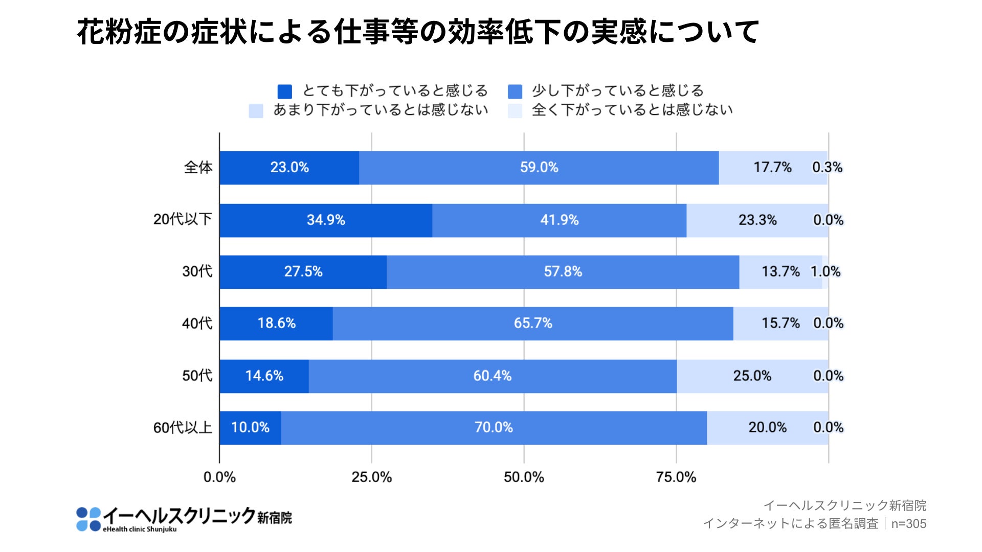 イーヘルスクリニック新宿院(東京都新宿区)は、花粉症の症状がある全国の一般生活者を対象に、花粉症治療に関するアンケート調査を実施しました。その結果、82%が「花粉症によって仕事等の効率が下がっている」と回答し、花粉症が日常生活や社会活動に大きな影響を与えている実態が明らかになりました。