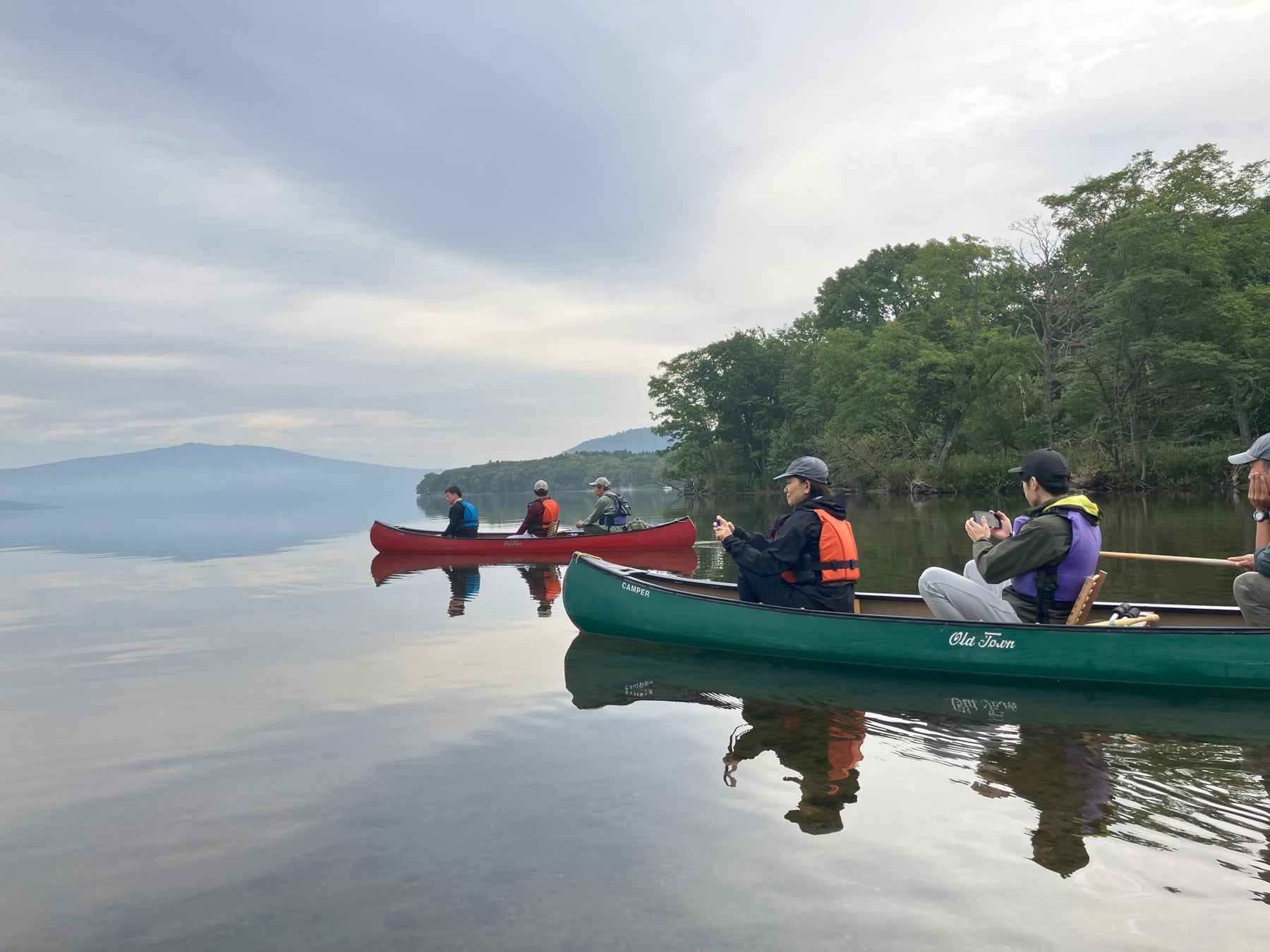 2日目は早朝から釧路川源流カヌー体験を実施、道東の自然のポテンシャルを肌で感じました。阿寒湖では光の森トレッキングに参加し、ATガイドのスキルを体験。ガイドの高田氏を囲んでのディスカッションも実施。