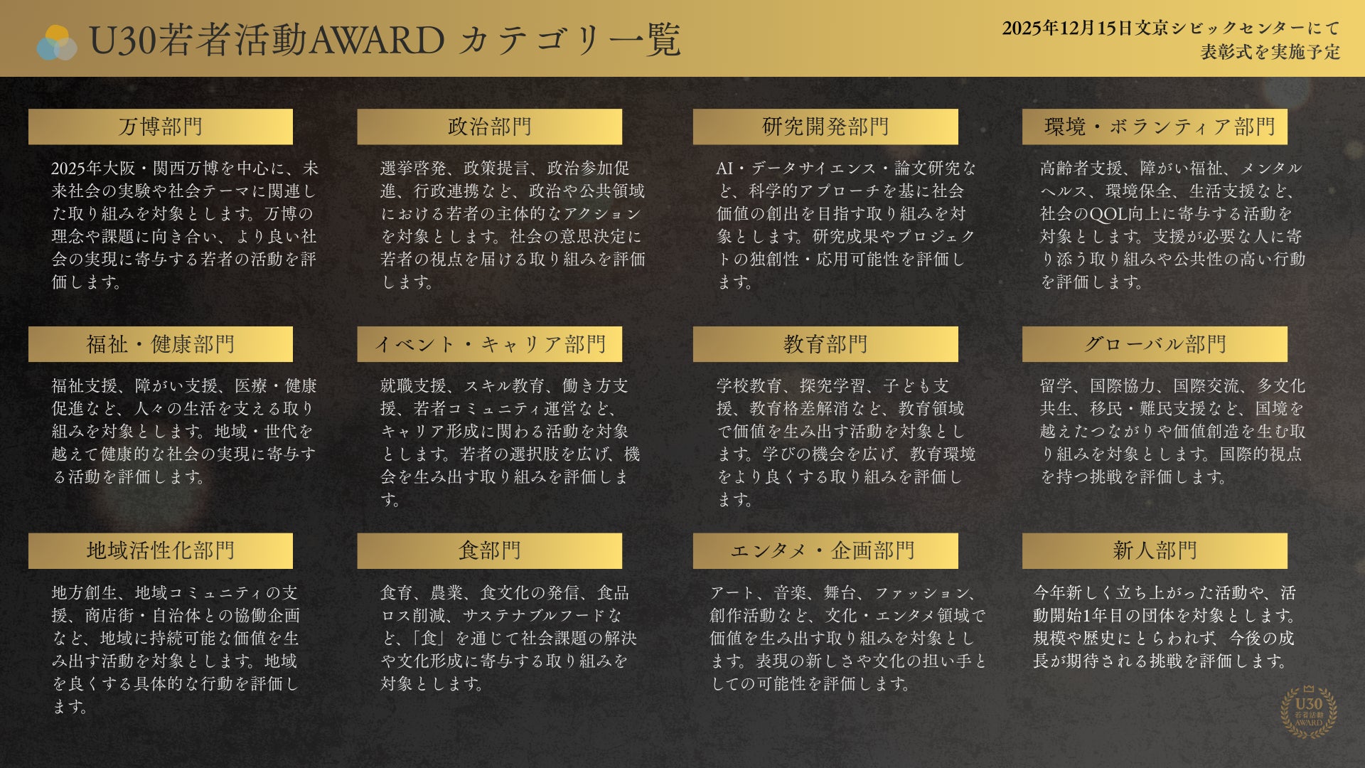 一般社団法人日本若者キャリア支援協会(所在地:東京都渋谷区、代表理事:岩﨑聖奈、以下 JYC)は、2025年12月15日(月)、文京シビックセンター 小ホールにて「U30若者活動AWARD2025」表彰式を開催し、全国から選出されたノミネート50団体(12部門)の中から、各部門の最優秀賞・優秀賞および「2025若者活動大賞」を決定・発表いたしました。