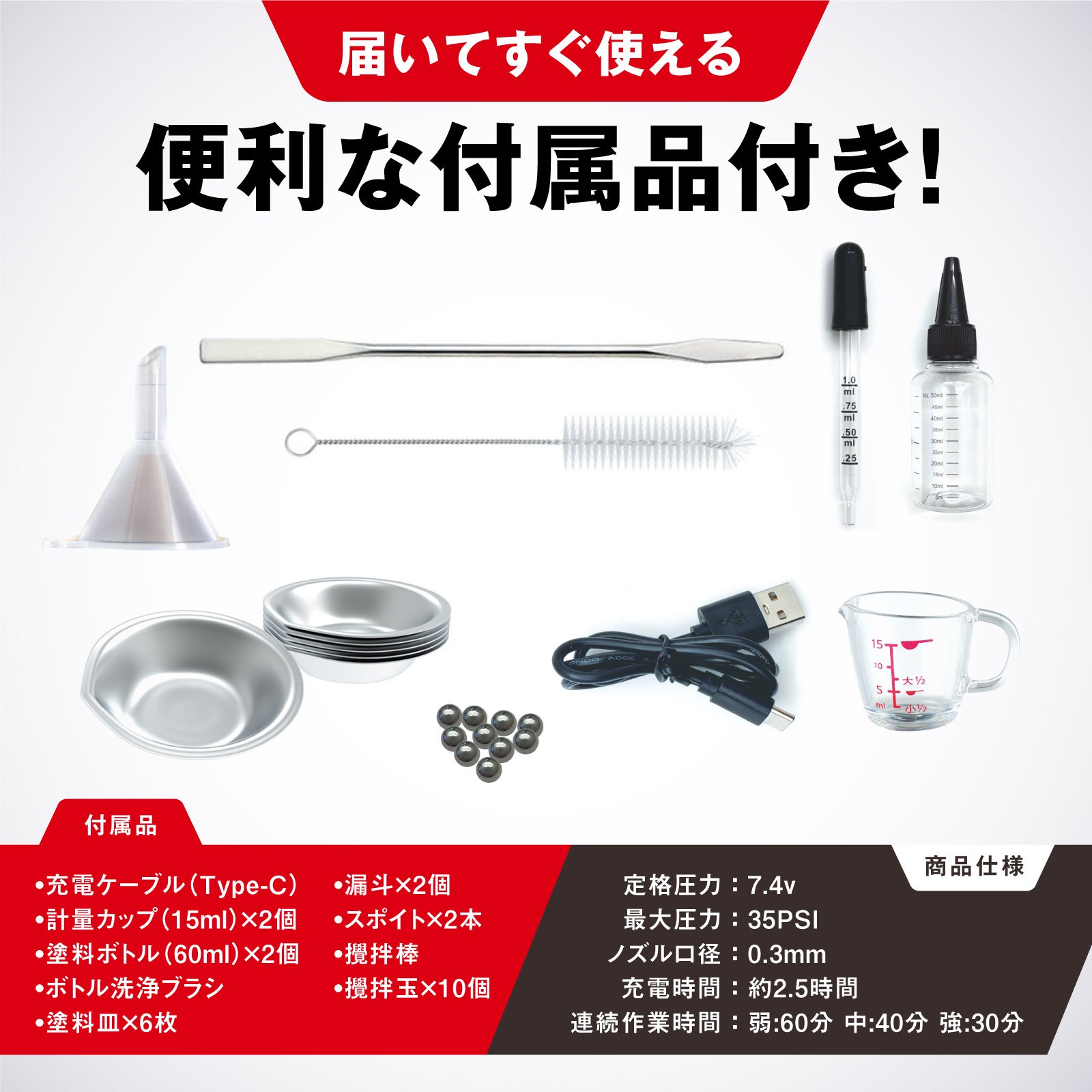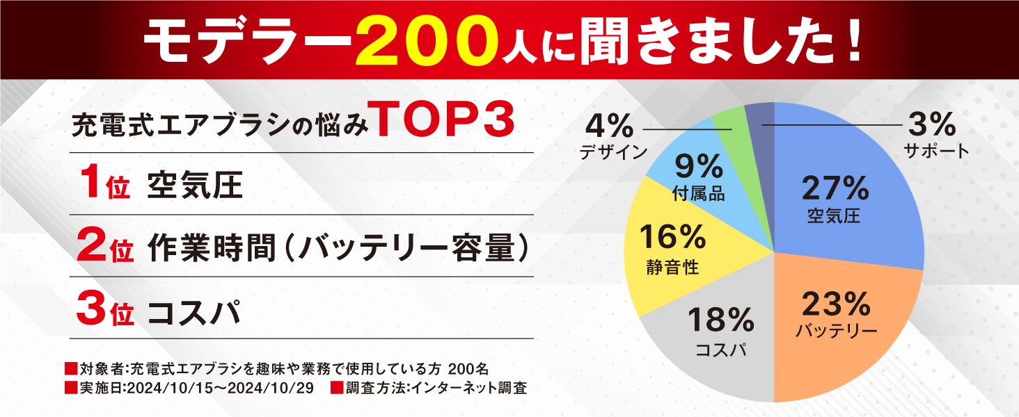 当社のエアブラシは、プロフェッショナルから初心者まで幅広くご利用いただけるよう、精密な噴霧性能と操作性を追求して開発されました。特に、均一で滑らかな塗装が可能な点や、長時間の使用でも手に負担がかからない軽量設計、到着後すぐに使用できるアイテムが多数付属する点が、多くのユーザーから高く評価されています。