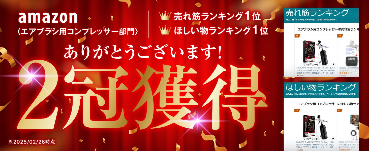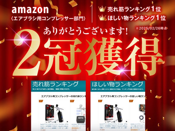 株式会社サチクル(本社:愛媛県今治市、代表取締役:村上 博司)が販売するエアブラシ製品が、2025年2月26日付でAmazonの「エアブラシ用コンプレッサー」カテゴリにおいて売れ筋ランキング1位、ほしいものランキング1位を獲得いたしました。これは、多くのお客様から高い評価とご支持をいただいた結果であり、心より感謝申し上げます。