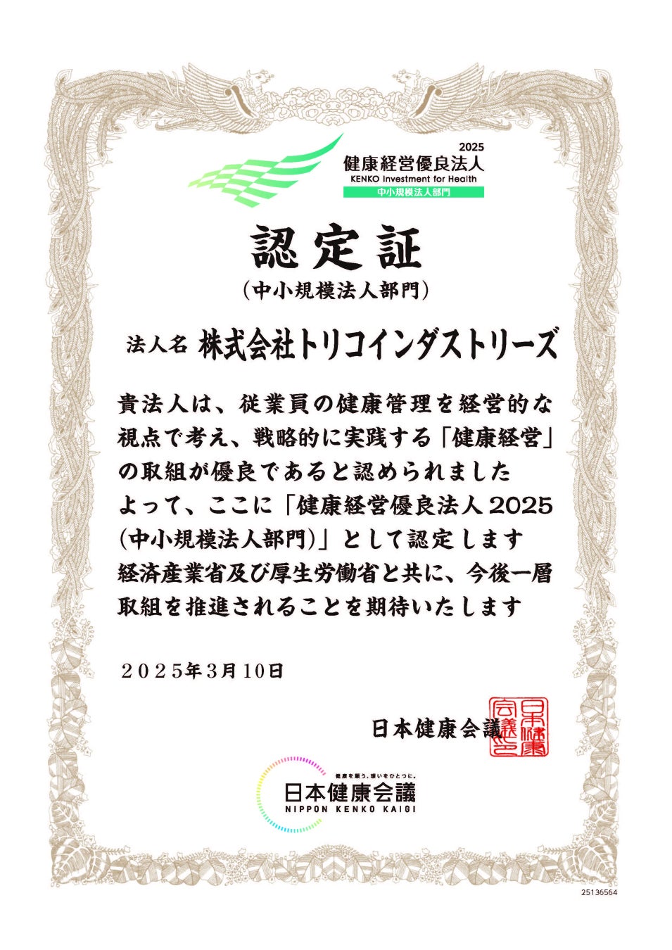 理美容ディーラーの株式会社ヘアラボ(本社:大阪市浪速区、代表取締役社長:村島有治)は2025年3月、経済産業省と日本健康会議が共同で実施する「健康経営優良法人2025(中小規模法人部門)」に初めて申請し、認定されましたので、お知らせいたします。また、グループ会社、理美容メーカーの株式会社トリコインダストリーズも「健康経営優良法人2025(中小規模法人部門)」に同時認定されました。トリコ・ヘアラボ・アロッタグループは、持続可能な開発目標(SDGs)のひとつ「目標8.