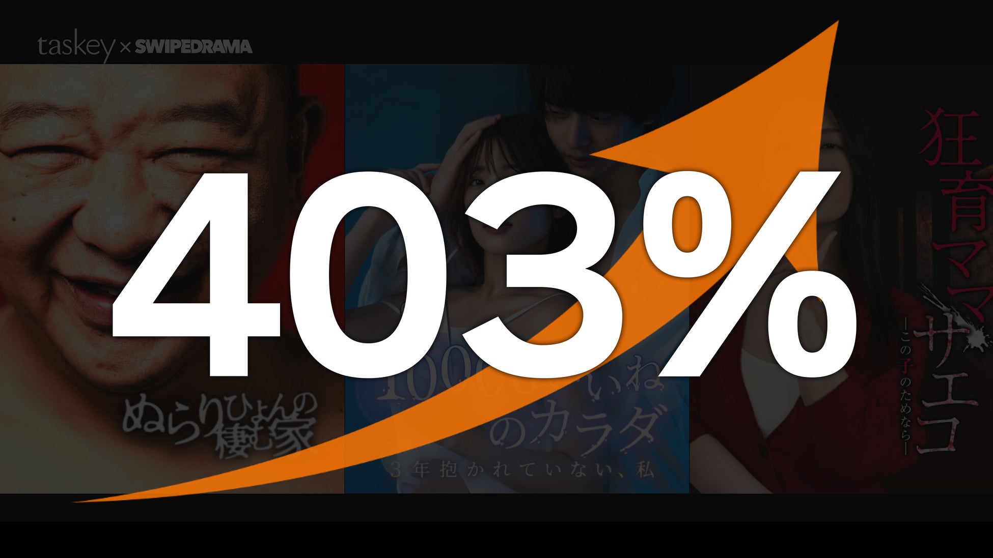 縦型ショートドラマアプリ「SWIPEDRAMA(スワドラ)」で配信されたtaskey原作の3作品が、配信開始から最大403%の売上増を記録。