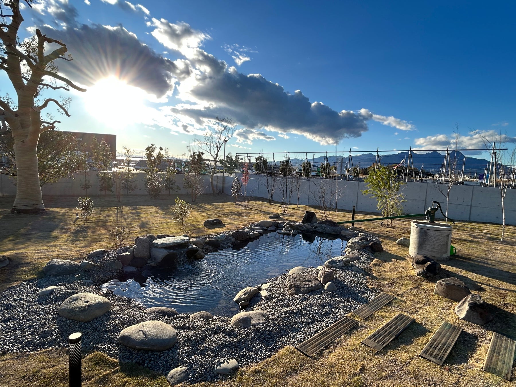 芝生広場で転んでも安心。じゃぶじゃぶ池は水道水を使用し、頻繁に水の入れ替えを実施。ご要望の応じて水位も調整可能です。
