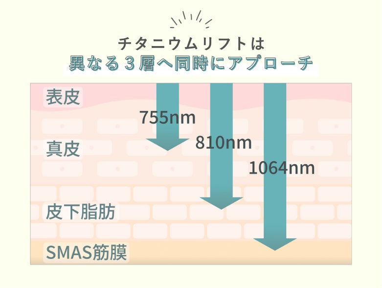 今までにない3種類の波長のレーザーを同時に照射できる機器だからこそ、それぞれのレーザーが一度に均一に真皮層~SMAS筋膜までの皮膚の異なる層に熱を届けることを実現しました。3種類のレーザーを同時に照射することでレーザーの特性を補完し合うことができるため、一台で様々な肌悩みに働きかけます。