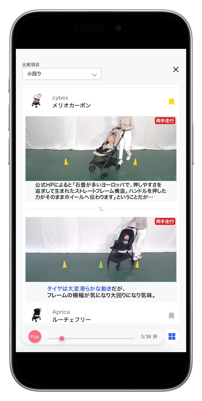 3月のローンチ以降、「ベビーカー」「紙おむつ」「抱っこ紐」といった育児用品ジャンルや、「クレンジング」といったママケア用品が毎週続々と追加。今回の新機能により、気になる商品の動画をスムーズに入れ替えて比較できるなど、今までにない便利な比較体験がさらに進化しました。