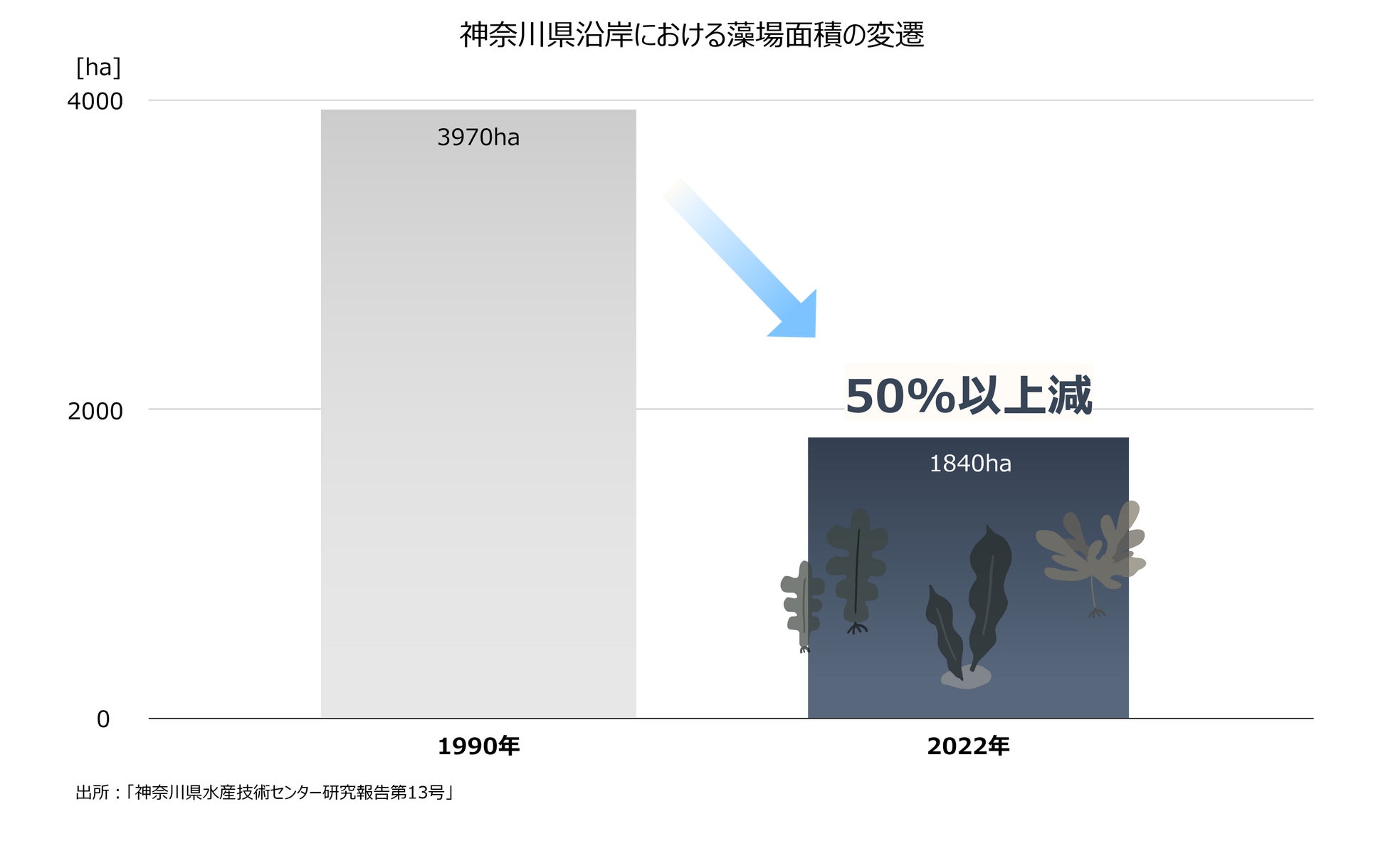 しかし、地球温暖化による海水温の上昇等の影響により、神奈川県内の藻場は1990年から2022年の間に約53.7%減少するなど、深刻な危機に直面しています。(*神奈川県水産技術センター調査)