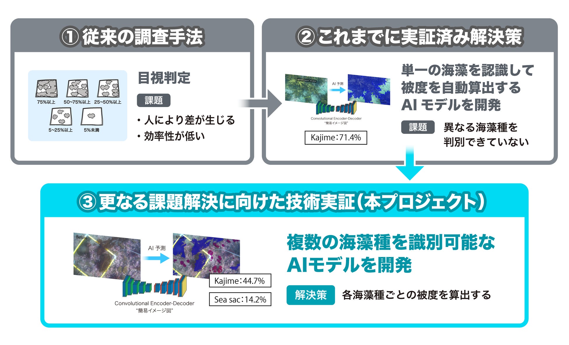 しかし、現状のAIモデルでは単一の種類の海藻しか認識できないという課題がありました。本取り組みでは複数種の海藻が混在する藻場でも被度が自動算出できるよう、種別判定AIモデルを新たに開発します。