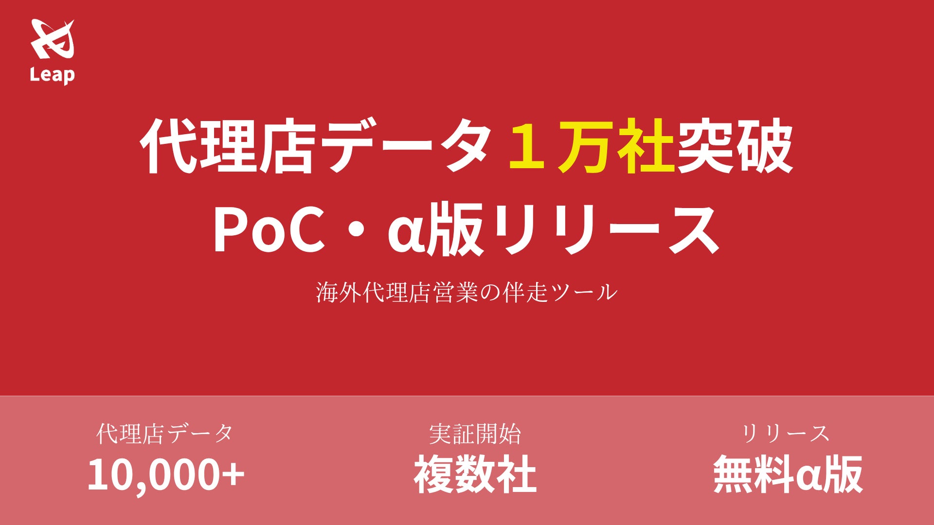 海外代理店営業の伴走ツール「Leap」を開発・提供する株式会社Leap(以下、当社)は、代理店データベースが1万社を突破したことを発表いたします。また、複数のお客様とのPoC(概念実証)を開始し、無料のα版をリリースしたことも合わせてお知らせいたします。