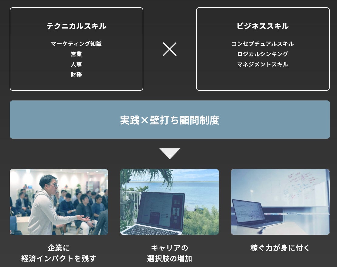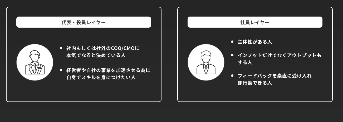 「学び」と「実践」を通じて、経営者としての視座を高め、事業をより強くすることを目的としています。