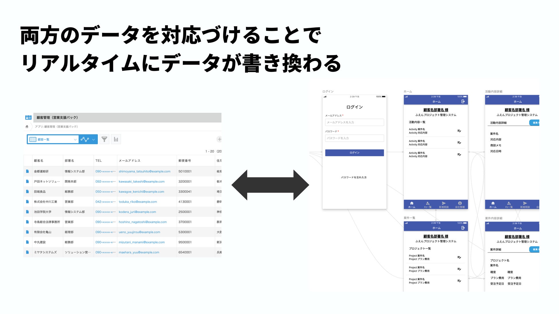 リアルタイム同期:Clickで操作したデータはkintoneに即時反映され、kintoneのデータもClick側で即座に更新可能。