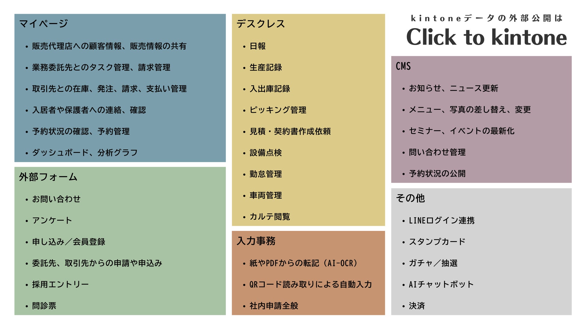 多くの企業では、kintoneのデータを外部に公開し、お客様やビジネスパートナーと効率的に情報共有をしたいというニーズがあります。