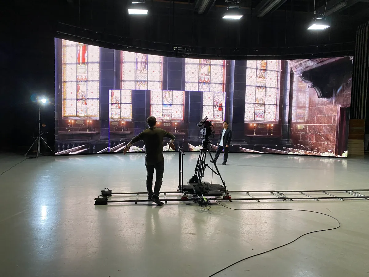 大型LEDパネルに3D背景を写し、実写の人物とリアルタイムに合成