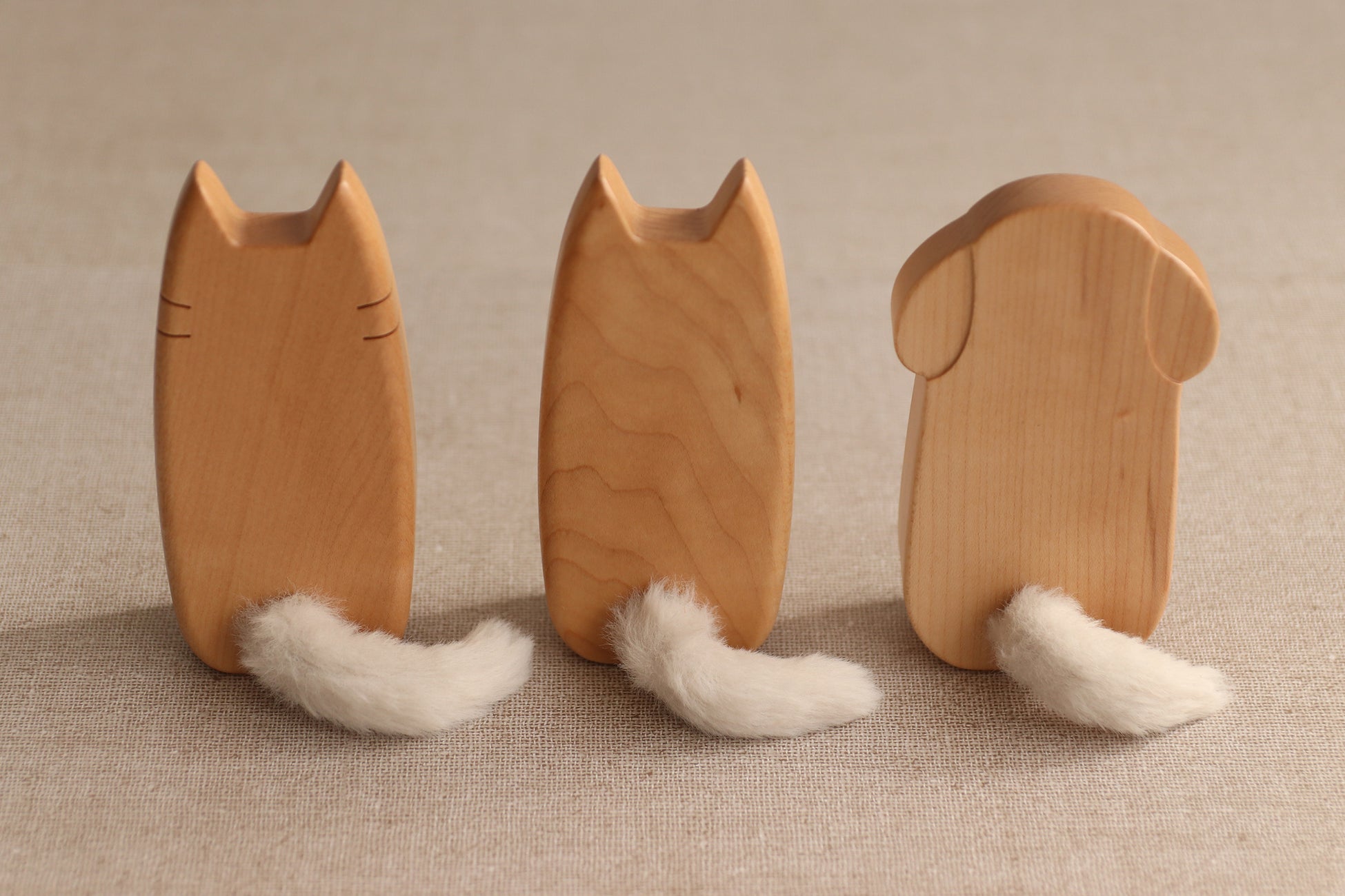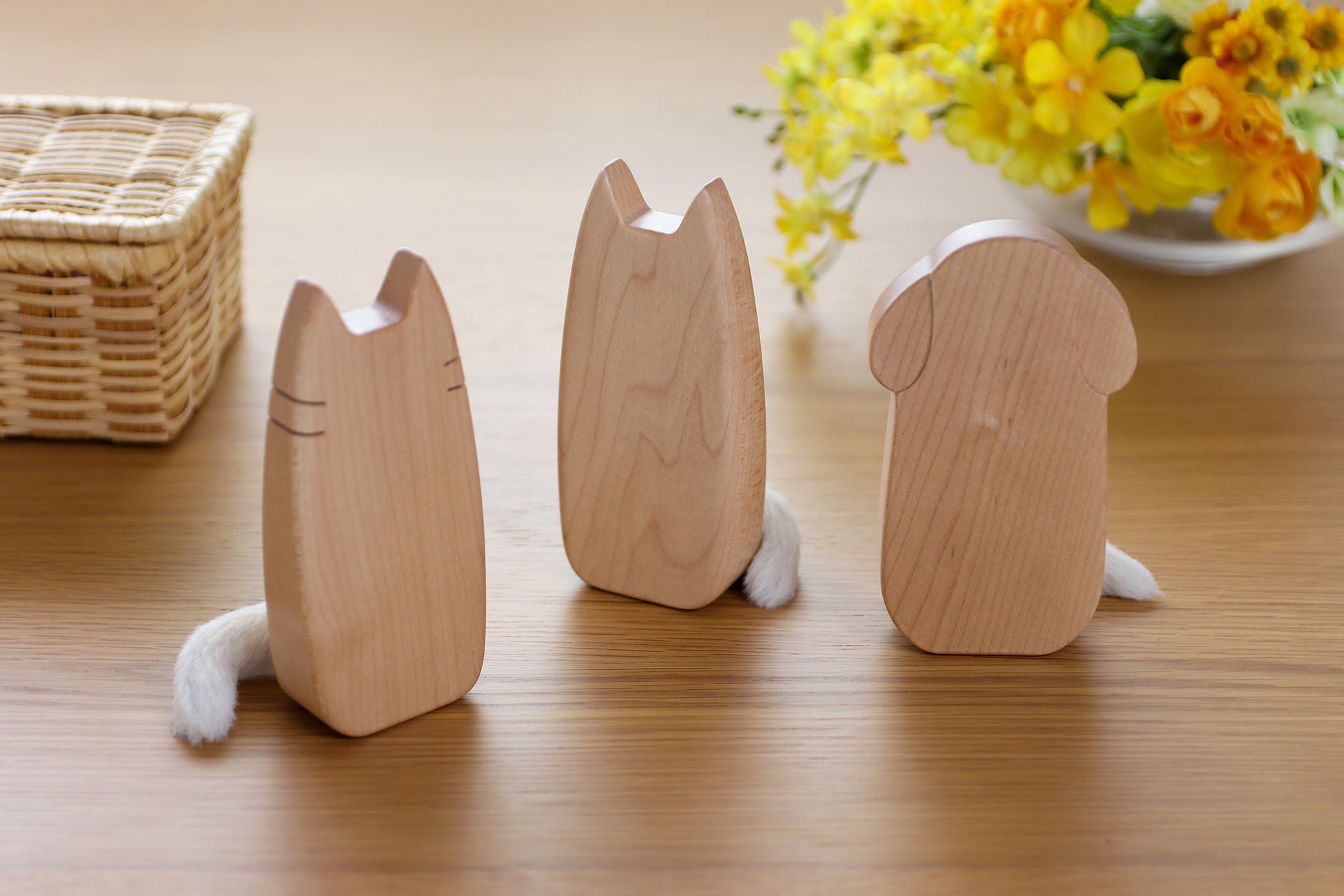 メープル材を使用し、しっぽをつけてお座りした姿を再現。猫の「ミーチョ」は1種類、犬の「ワンチョ」は立ち耳のAタイプとたれ耳のBタイプの2種類をご用意しています。底に向けて厚みがあり、自立する設計です。