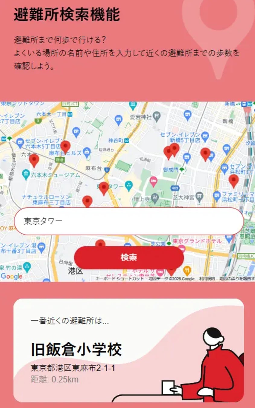 デジタルネイティブと言われるこの世代は、スマートフォンの普及によりその利便性を活用できる反面、災害時に通信が途絶するなどの非常時の経験が少なく、今回の施策では、通信がない状態でも近くの避難所の場所と距離をスクリーンショットで保存いただき、災害時に備えていただくことを推奨いたします。