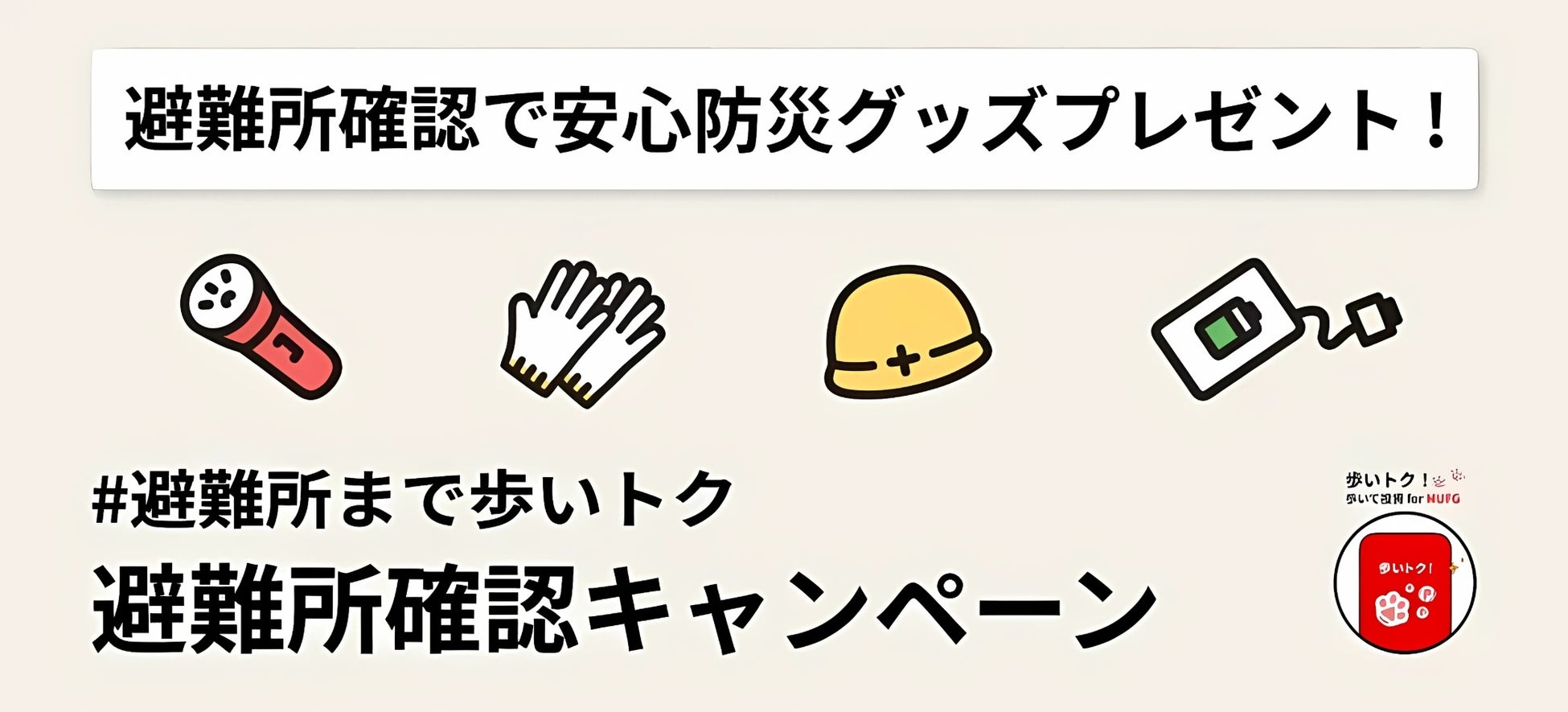 「歩いトク! for MUFG」では、防災意識の向上にお役立ちできるよう、みなさまの近くの避難所(*1)をご確認いただける特設サイトをご用意しました。その「歩数」をシェア(*2)いただくことで、最大10万円分の防災グッズが当たるキャンペーンを実施いたします。