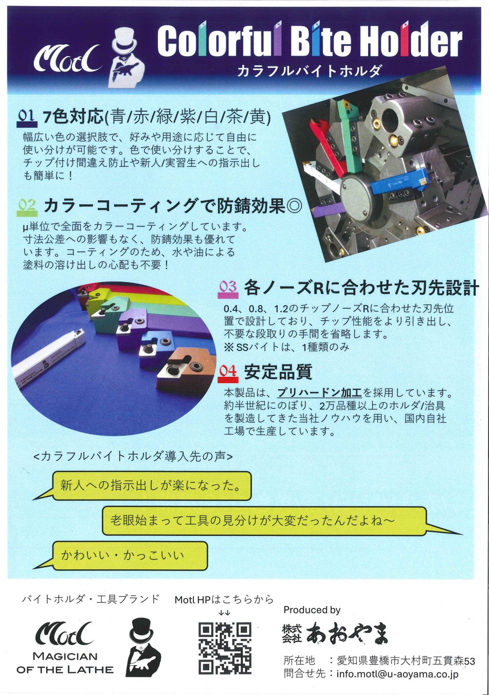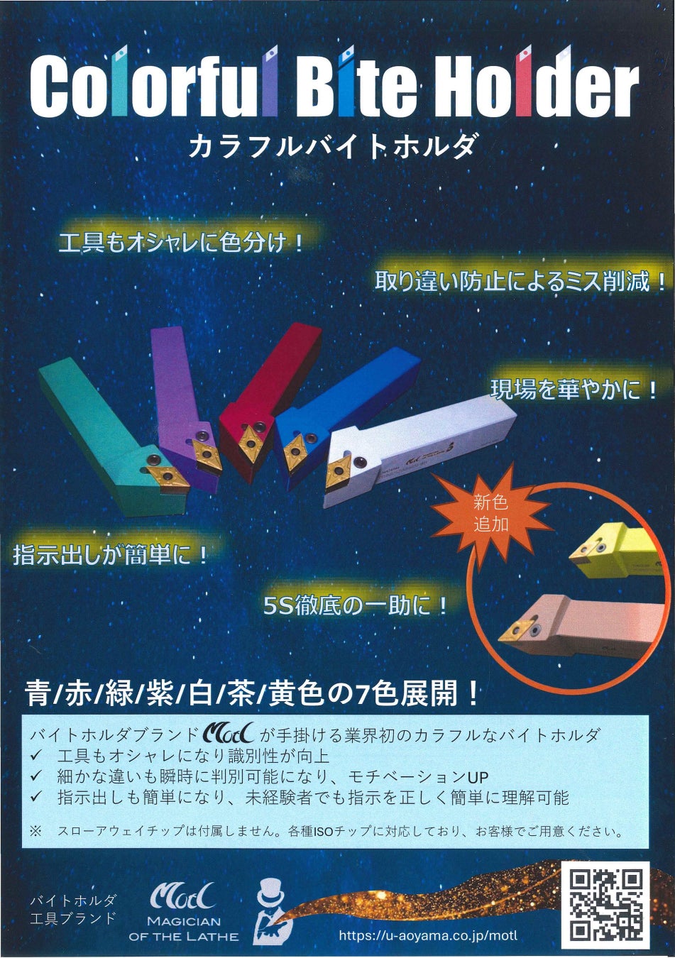 「Magician of the Lath」ブランドで切削工具を製造する株式会社あおやま(本社:愛知県豊橋市、代表取締役:青山雄治)は、”現場を明るくする”「カラフルバイトホルダ」を東京ビッグサイトで開催される「産業交流展」、「ものづくり補助事業 中小企業 新ものづくり・新サービス展」に出展*¹します。