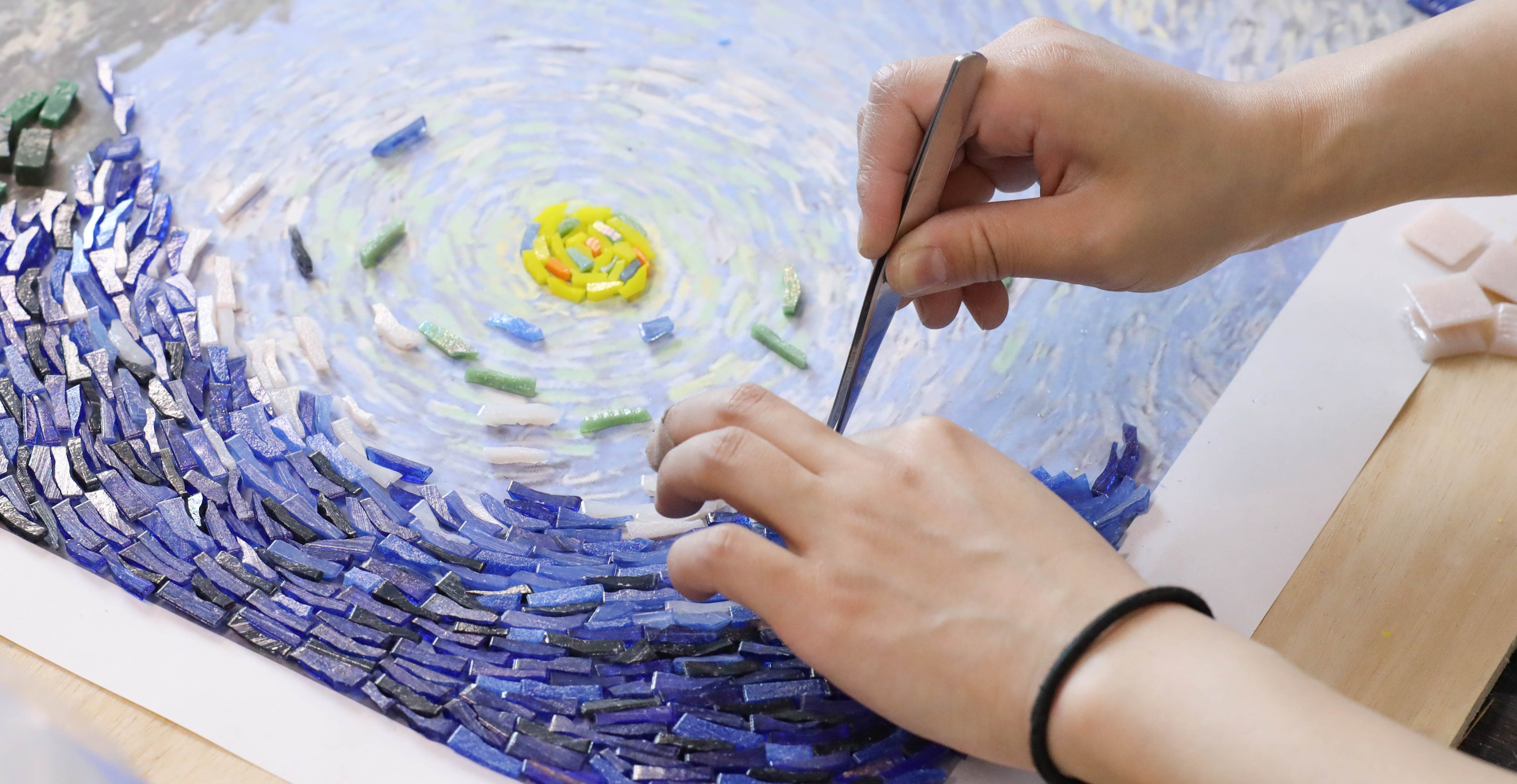 モザイクタイルアートは、多様なタイルを組み合わせ、光の当たり方で表情を変える立体感と深みが魅力です。職人が一粒ずつ手作業でタイルを割ったり並べたりすることで、写真では表現できない温かみのあるタッチを再現します。