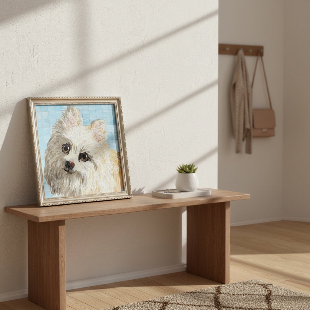 完成したアートは、そのまま壁にかけたり、棚に飾ったりできるよう板材に貼ってお届けします。お部屋の主役となるインテリアとして、毎日愛犬の存在を感じていただけます。
