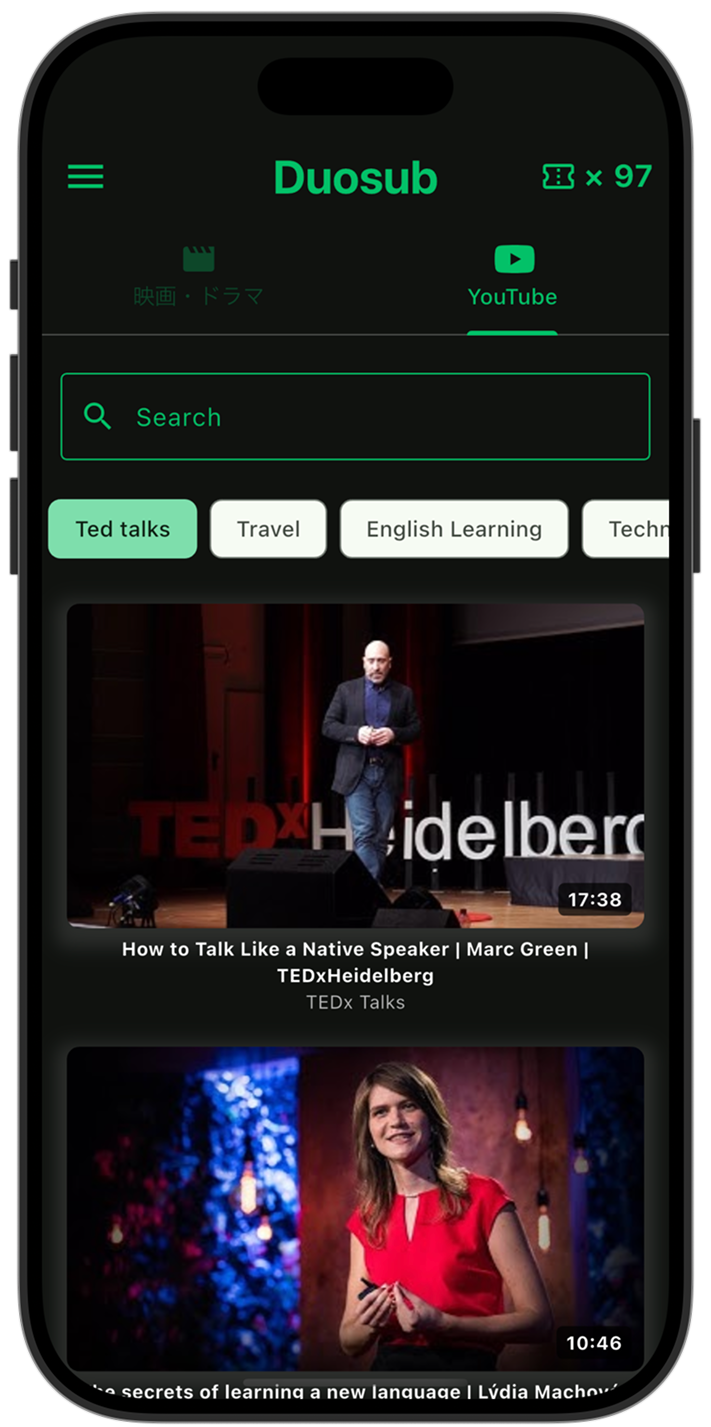 今まで、Duosubは映画やドラマにしか対応しておらず、NetflixやU-NEXT, Amazonプライムビデオといった動画配信アプリで映画やドラマを再生する必要がありましたが、本アップデートによってYouTubeにも対応し、好きな海外のYouTube動画を英語字幕・日本語訳と一緒に楽しめるようになります。
