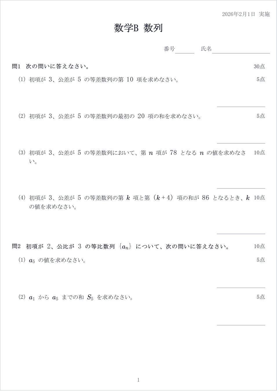 数学や理科の複雑な数式も、LaTeXエンジンにより美しくレンダリングされます。作成したテストは、市販の教材レベルの品質でPDF出力され、そのまま印刷して授業や試験で使用可能です。