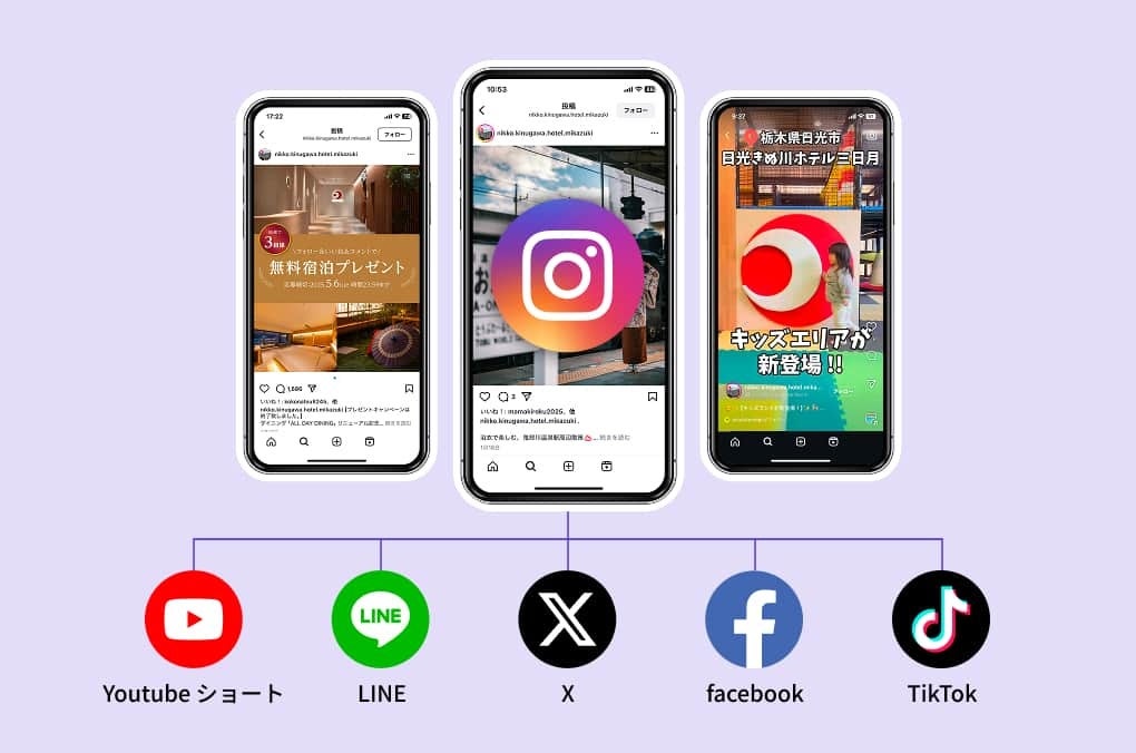 栃木県鬼怒川温泉で長年愛され続ける日光きぬ川ホテル三日月様。家族連れやインバウンド客からも高い人気を誇る同ホテルでは、さらなる集客強化と予約媒体依存からの脱却を目的に、Instagramの運用を本格化。Instagramを中心にしたSNS運用支援を、imadokiで行なっています。