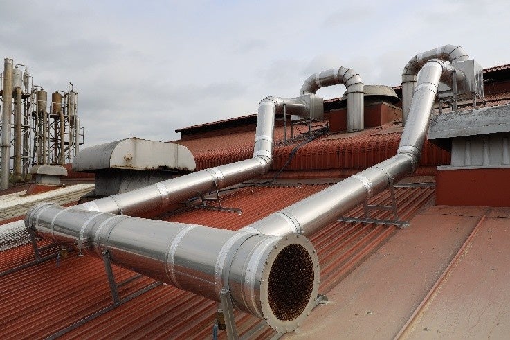 初期の計画では「脱臭機」の使用を検討していましたが、サイズが想定より大きく、設置場所の確保が困難であったこと、また、設置場所付近にある通気式ドライヤー周辺の温度が170℃を超えるため、「脱臭機」の変形リスクがありました。