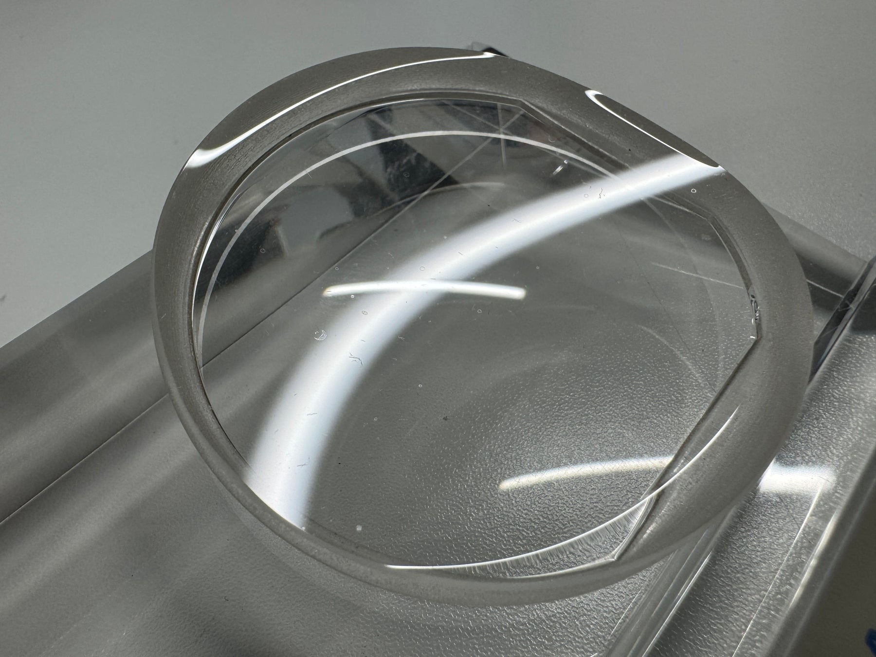 成形技術においては、ガラス材料の熱膨張係数とクリアランスを精密に考慮した金型構造を設計し、シミュレーションに基づく最適な成形条件を確立しました。これにより、直径1mmの微小レンズから直径100mm近い大型光学部品まで、幅広いサイズに対応可能です。また、円形形状はもちろん、矩形や位置決め用の複雑形状が付与された製品も、高精度に一発成形を実現しています。