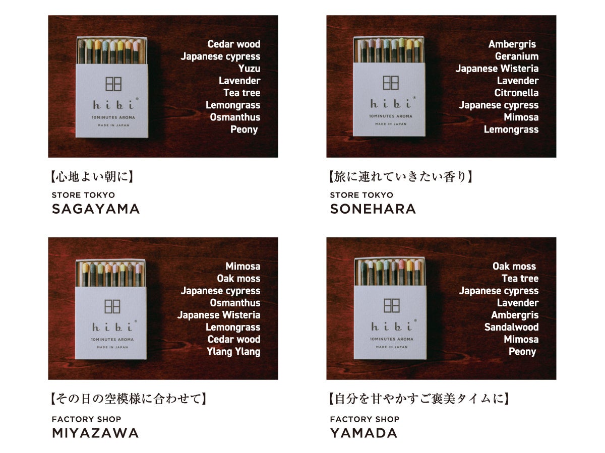 〈hibi for you〉とは、ふだん東京・兵庫の実店舗でのみ行っているサービスで、実際に火をつけて香りをテイスティングしながら、ご自分だけの8本入りアソートボックスを作ってお持ち帰りいただけるもの。今回はその〈hibi for you〉を全国にお届けするため、4名のショップスタッフが4種のアソートボックスをセレクトしました。それぞれがお気に入りの「香りのある場面」を思い浮かべて選んだ組み合わせを、どうぞお楽しみください。