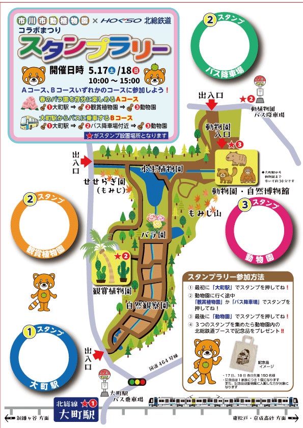 今回は市川市動植物園をよりお楽しみいただける企画として初のコラボスタンプラリーを実施します。見頃を迎える観賞植物園に咲き誇る約110種、934株の多彩な春バラを巡りながらイベント会場に足を運んでいただけるAコース。イベント当日運行する北総線・大町駅と市川市動植物園を結ぶ無料臨時送迎バスに乗車して参加できるBコースの2コースをご用意しました。異なるスタンプを3つ集めてイベント会場へチラシをお持ちいただくと、各日先着150名様にスタンプラリーでしか手に入らない「市川市×北総鉄道コラボトートバック」をプレゼント。