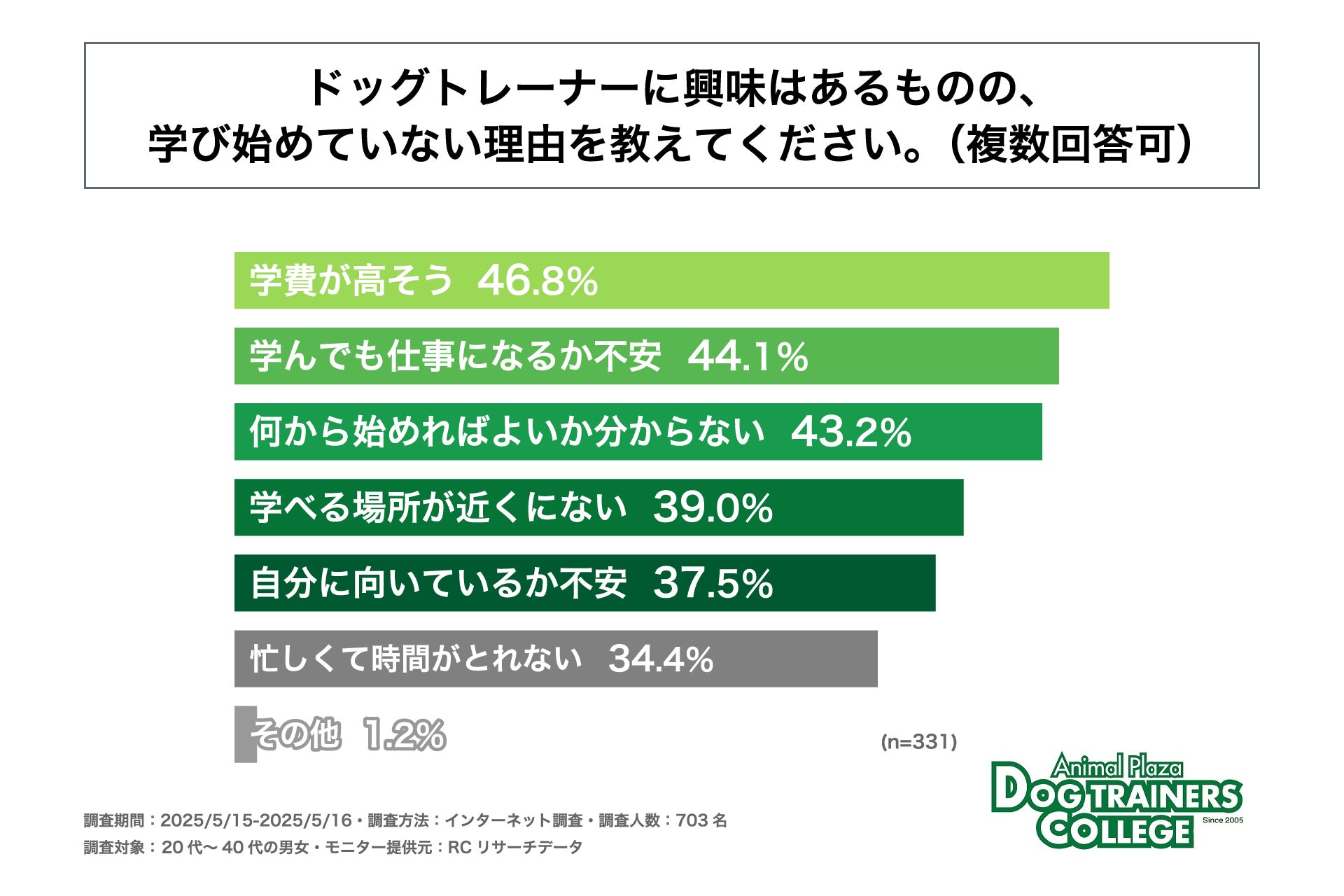 ドッグトレーナーに興味はあるものの、学び始めていない理由のトップ3は、1位「学費が高そう」、2位「学んでも仕事になるか不安」、3位「何から始めればよいか分からない」