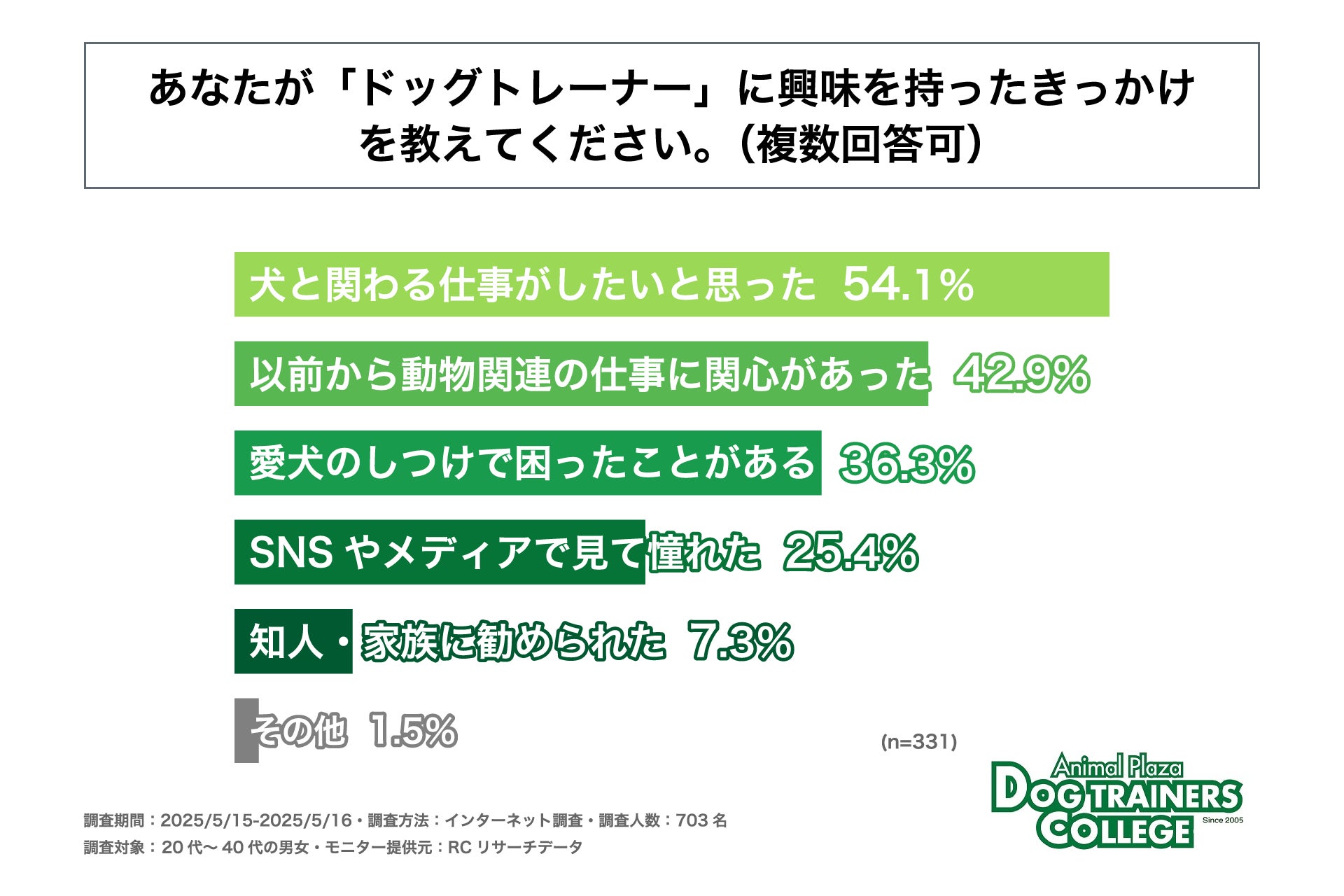 次に、ドッグトレーナーに興味があると回答した方に「『ドッグトレーナー』に興味を持ったきっかけ」を尋ねる設問への回答では、1位が「犬と関わる仕事がしたいと思った」で54.1%、2位が「以前から動物関連の仕事に関心があった」で42.9%、3位が「愛犬のしつけで困ったことがある」で36.3%という結果になりました。この結果から、ドッグトレーナーに興味を持った主なきっかけは、「犬と関わる仕事がしたいと思ったから」や「以前から動物関連の仕事に関心があったから」であることがわかりました。