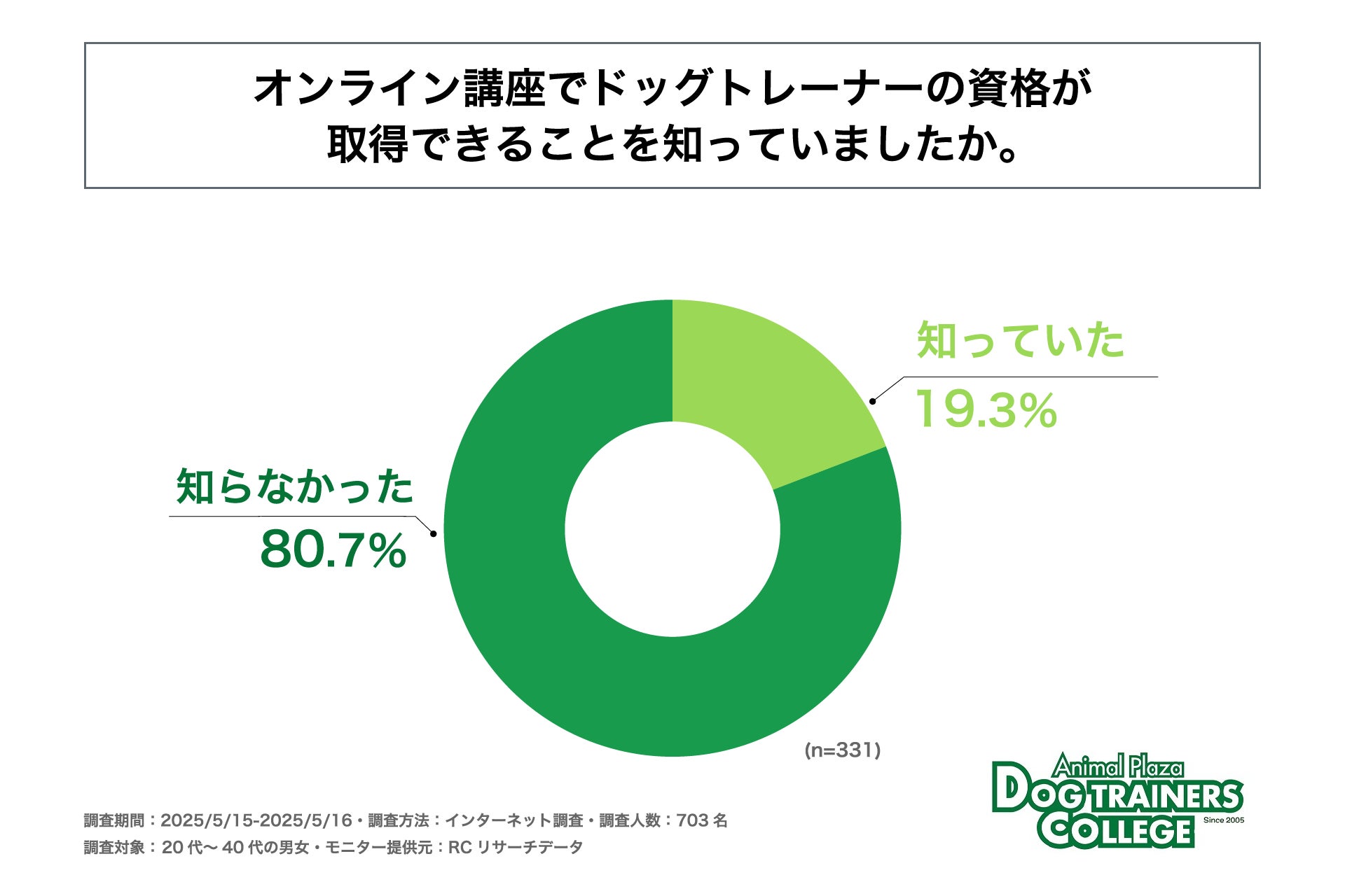 次に、ドッグトレーナーに興味のあると回答した方に「オンライン講座でドッグトレーナーの資格が取得できることを知っているか」を尋ねる設問への回答では、「知らなかった」が80.7%、「知っていた」が19.3%という結果になりました。この結果から、ドッグトレーナーに興味がある20代~40代の男女の約8割が、オンライン講座でドッグトレーナーの資格が取得できることを知らなかったことがわかりました。