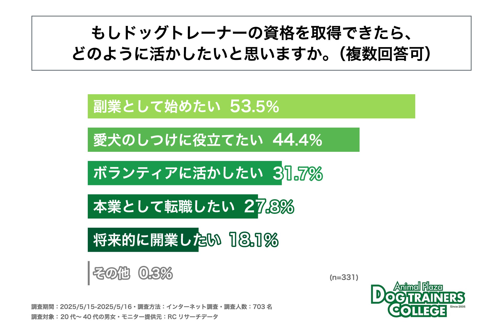 調査の最後、ドッグトレーナーに興味のあると回答した方に「もしドッグトレーナーの資格を取得できたら、どのように活かしたいと思うか」を尋ねる設問への回答では、1位が「副業として始めたい」で53.5%、2位が「愛犬のしつけに役立てたい」で44.4%、3位が「ボランティアに活かしたい」で31.7%という結果になりました。この結果から、ドッグトレーナーの資格を取得できたら活かしたいと思うことは主に、「副業として始めること」や「愛犬のしつけに役立てること」であることがわかりました。