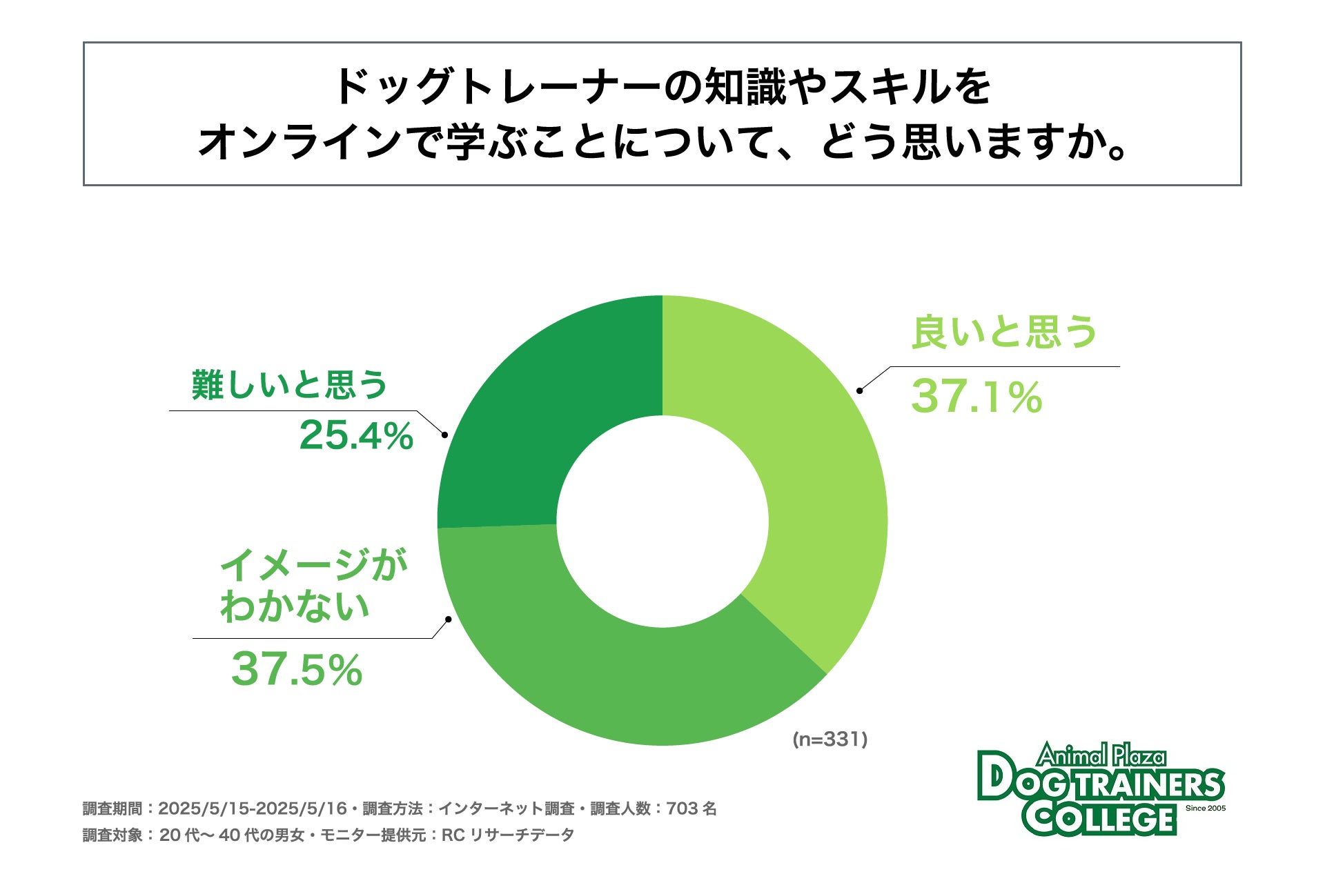 ドッグトレーナーに興味がある20代~40代の男女の約4割が、ドッグトレーナーの知識やスキルをオンラインで学ぶことについて良いと思っている