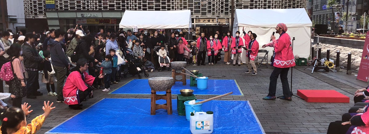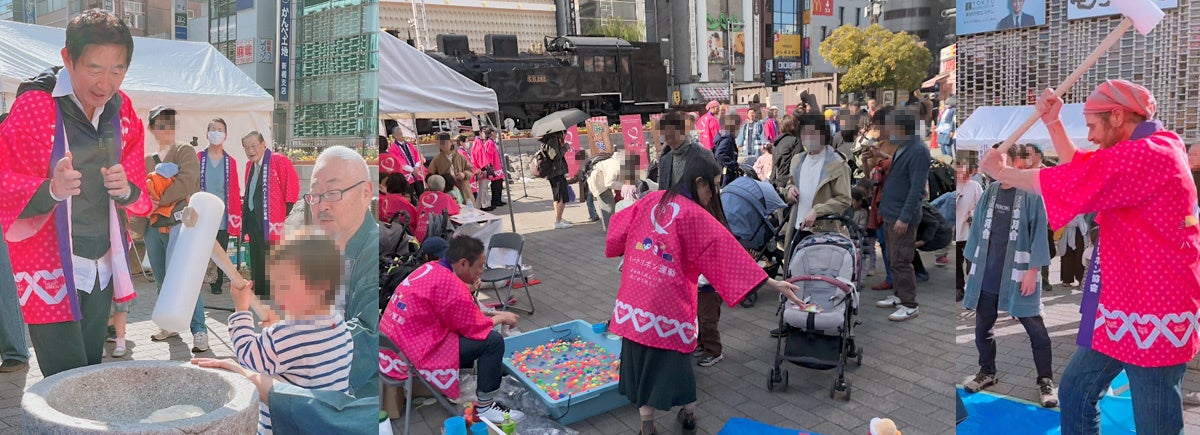 2025年3月1日(土)、みんな食堂特別開催として、新橋駅西口SL広場にて親子で楽しめる餅つき大会を開催しました。春本番を思わせる暖かい気候の中、多くの子育て家庭に参加してもらいました。
