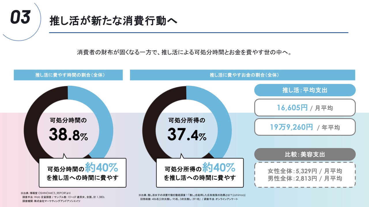 消費者の財布が固くなる一方で推しに対する可処分時間と可処分所得が右肩上がりな市場にはなっています。消費者の中には手作りグッズやオリジナルアイテムなどを楽しむファンコミュニケーションが生成されておりファン同士の一体感が見受けられます。