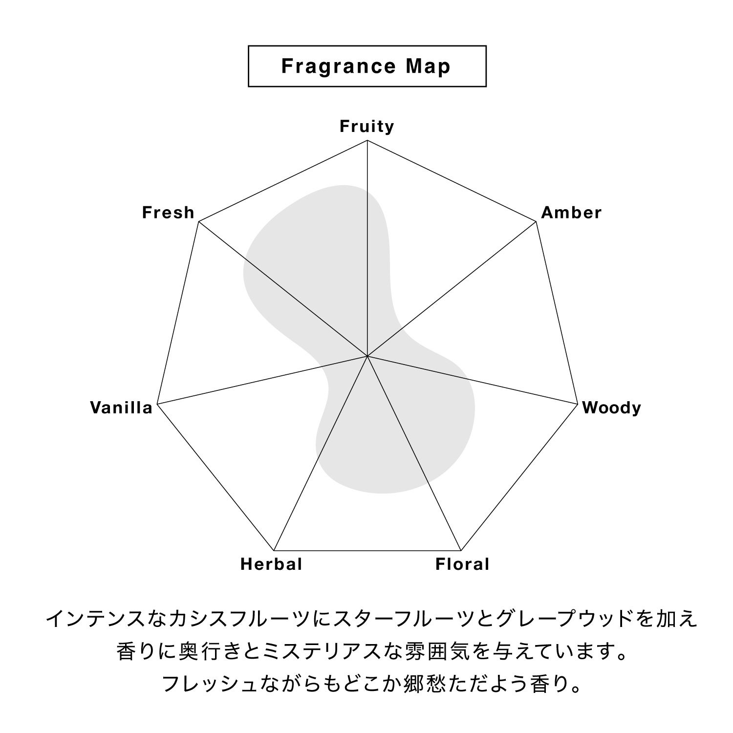 インテンスなカシスフルーツにスターフルーツとグレープウッドを加え香りに奥行きとミステリアスな雰囲気を与えています。フレッシュながらもどこか郷愁ただよう香り。
