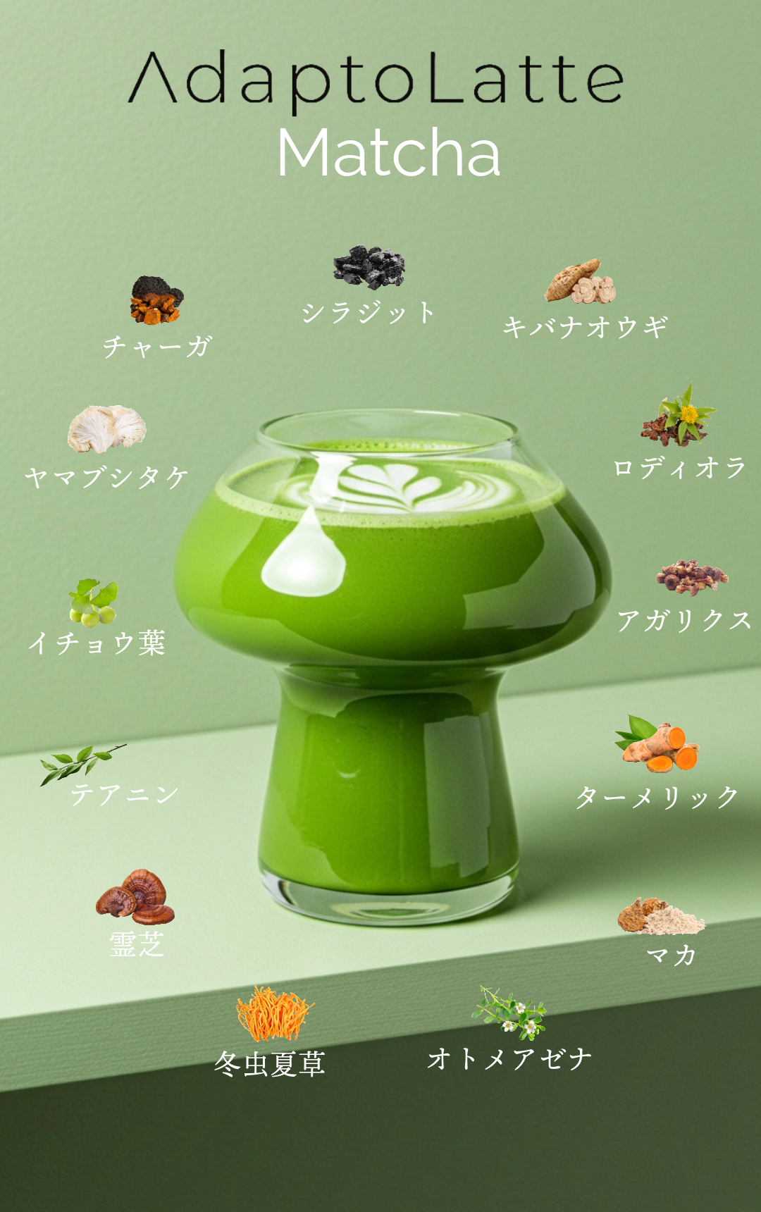 人気の機能性素材14種はそのままに、上質なプレミアム抹茶を加えた「アダプトラテ 抹茶」が新登場。