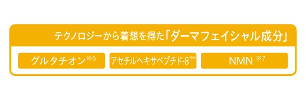 ※1加水分解カイメン(基剤) ※2オリゴペプチド-20(保湿成分) ※3オリゴペプチド-24(保湿成分) ※4オリゴペプチド-34(保湿成分) ※5アセチルデカペプチド-3(保湿成分) ※6保湿成分 ※7ニコチンアミドモノヌクレオチド(保湿成分) ※8肌にうるおいを与え、乾燥により目立った毛穴を目立たなくすること ※9乾燥してキメが乱れた肌 ※10うるおいを与えることで艶やかに見える印象 ※11加水分解カイメン(基剤)、ヘキシル3-グリセリルアスコルビン酸(保湿成分) ※12金、ヘキシル3-グリセリルアスコルビン酸(保湿成分)※13ヘキシル3-グリセリルアスコルビン酸(保湿成分) ※14効能評価試験済み ※15年齢に応じたケア ※16加水分解カイメン(基剤)、パルミチン酸レチノール(保湿成分) ※17金、パルミチン酸レチノール(保湿成分) ※18パルミチン酸レチノール(保湿成分) ※19加水分解カイメン(基剤)、ヒト脂肪由来間葉系細胞エクソソーム(保湿成分) ※20金、ヒト脂肪由来間葉系細胞エクソソーム(保湿成分)) ※21ヒト脂肪由来間葉系細胞エクソソーム(保湿成分) ※22肌の水分、油分を補い保つこと ※23加水分解カイメン(基剤)、アゼロイルジグリシンK(整肌成分) ※24金、アゼロイルジグリシンK(整肌成分) ※25アゼロイルジグリシンK(整肌成分)*角質層まで