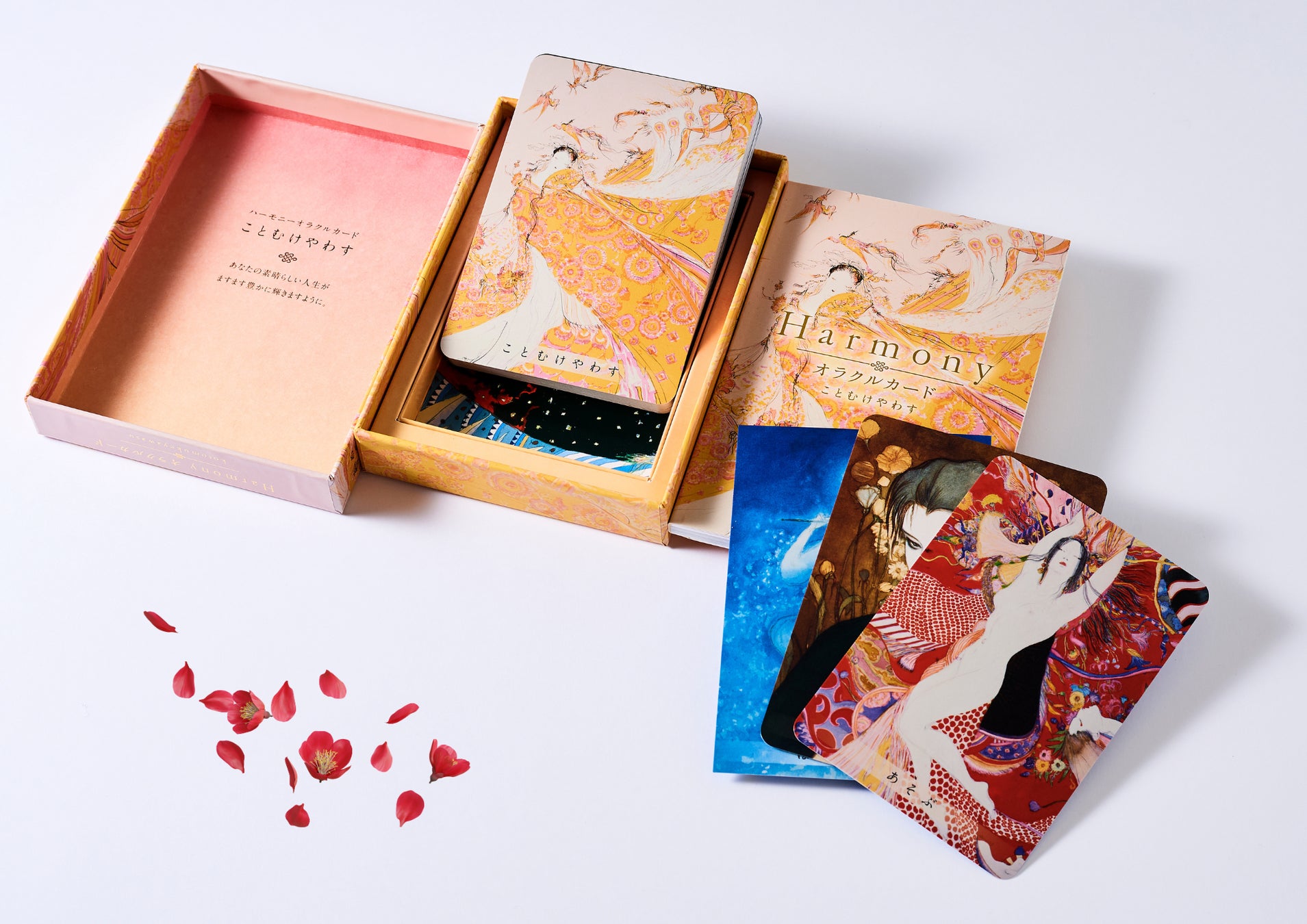 今回発売されるオラクルカード『Harmonyオラクルカード ことむけやわす』は、世界的アーティスト:天野喜孝のアート作品をカード絵として贅沢に用い、作家:はせくらみゆきが『古事記』を典拠とする大和言葉「ことむけやわす」をテーマにカードメッセージを執筆、壮大なファンタジーの世界観と、日本語の美しさをちりばめた、世界でただ一つ、唯一無二のオラクルカードです。