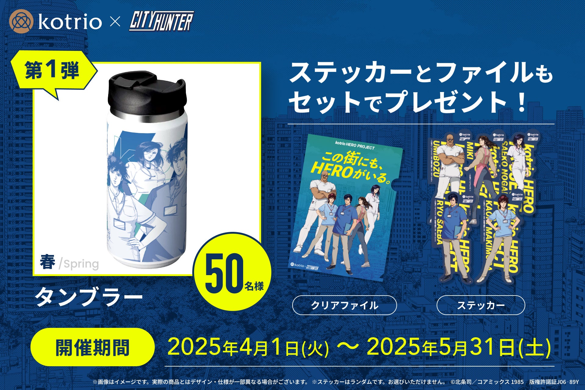 2025年4月よりスタートする“kotrio HERO PROJECT(以下本プロジェクト)”では、大人気マンガ『シティーハンター』とのコラボレーションが決定。直接的に人を助け、救うだけでなく、日本が抱える医療福祉業界の人材不足という課題に立ち向かっている医療福祉職を「ヒーロー」として再定義し、『シティーハンター』を通してその魅力を広く発信することで、医療福祉職への就職を志す人を増やしていくことを目的としています。今回のコラボレーションを記念して、ここでしか手に入らないコラボアイテムが当たるプレゼントキャンペーンも開催いたします。