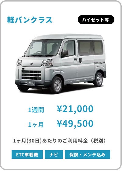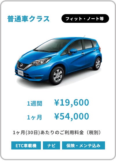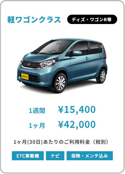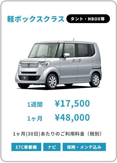 さらに貸代中のメンテナンス費用・ナビ/ETC・保険料など他社ではオプションになる費用も全てコミコミの安心価格!軽ワゴンクラス以上の車両に関してはETC・ナビも全車両無料完備!