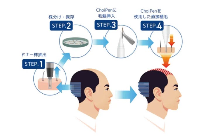 DHI自毛植毛法は、後頭部から採取した健康な毛髪を専用の「ChoiPen」で直接移植する