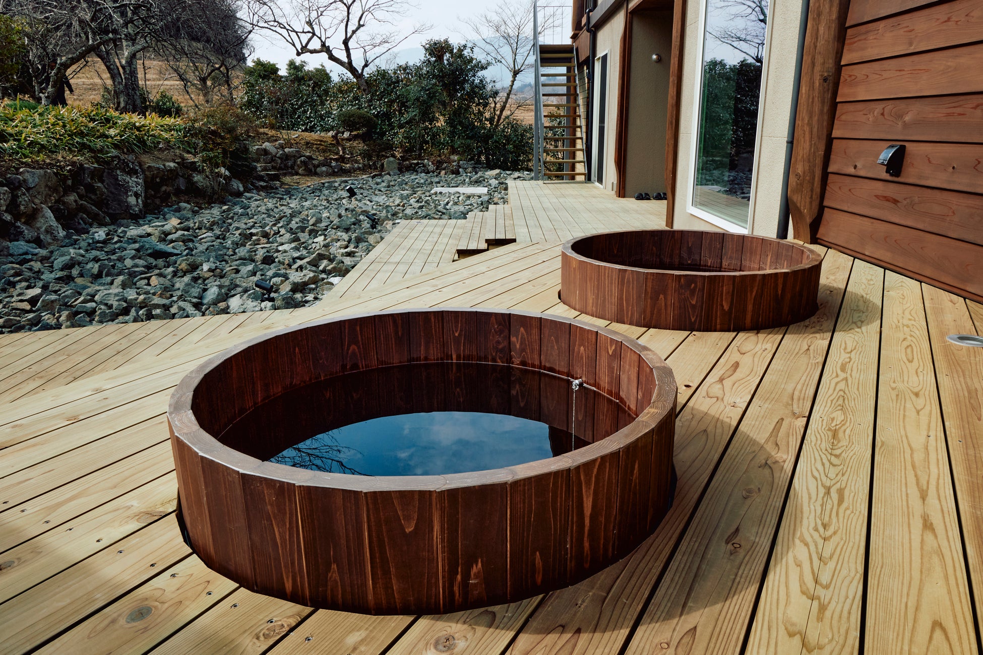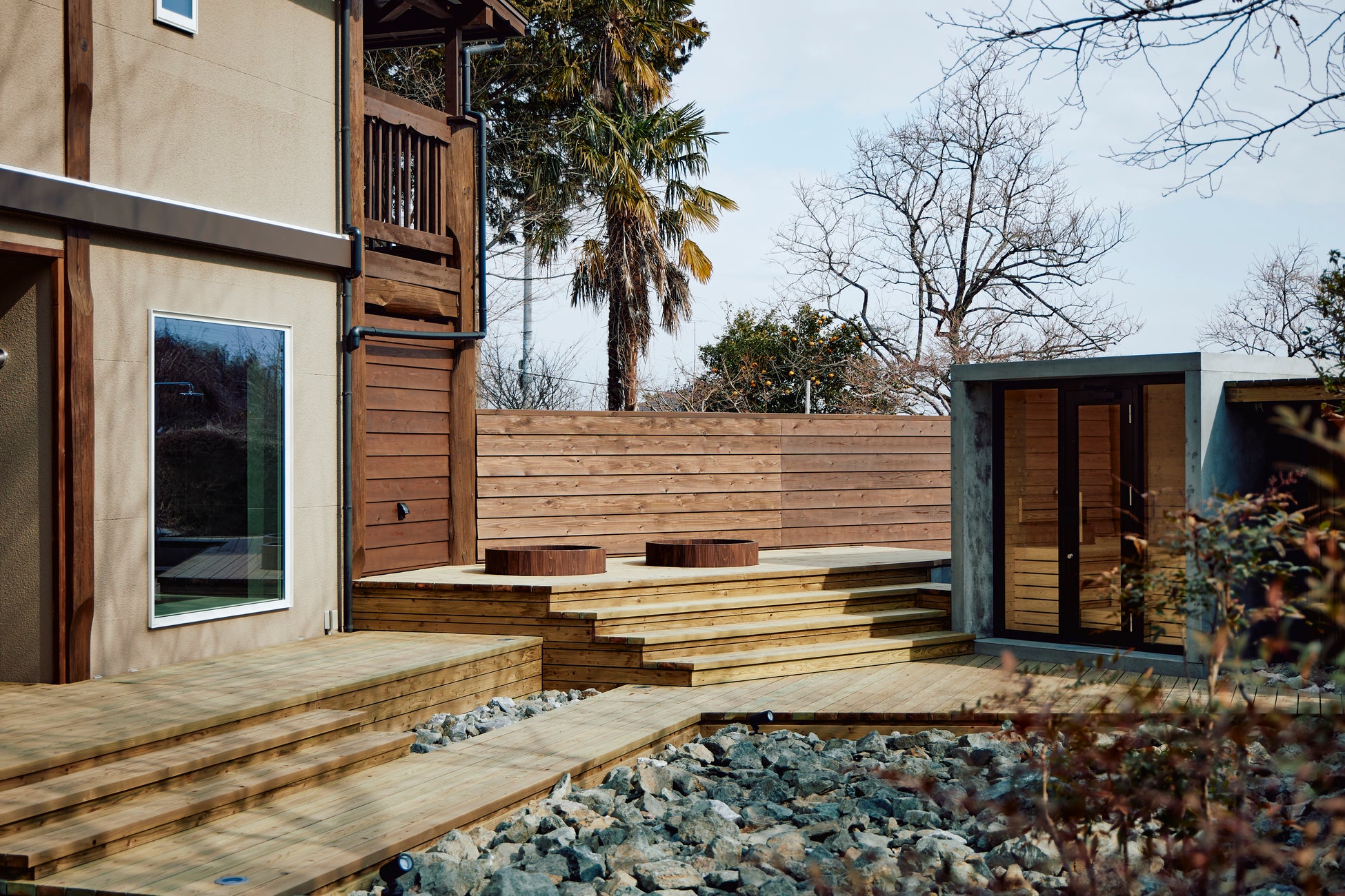 ウッドデッキ埋め込み型水風呂や、立体感ある外気浴エリアを存分にお楽しみください。温かいお風呂も用意してあります。