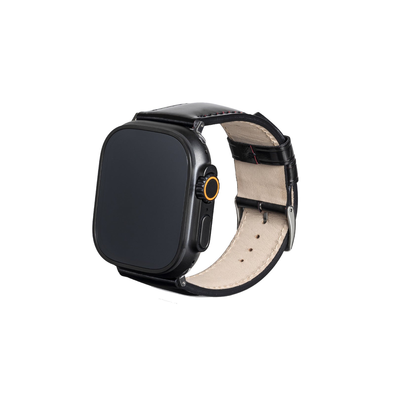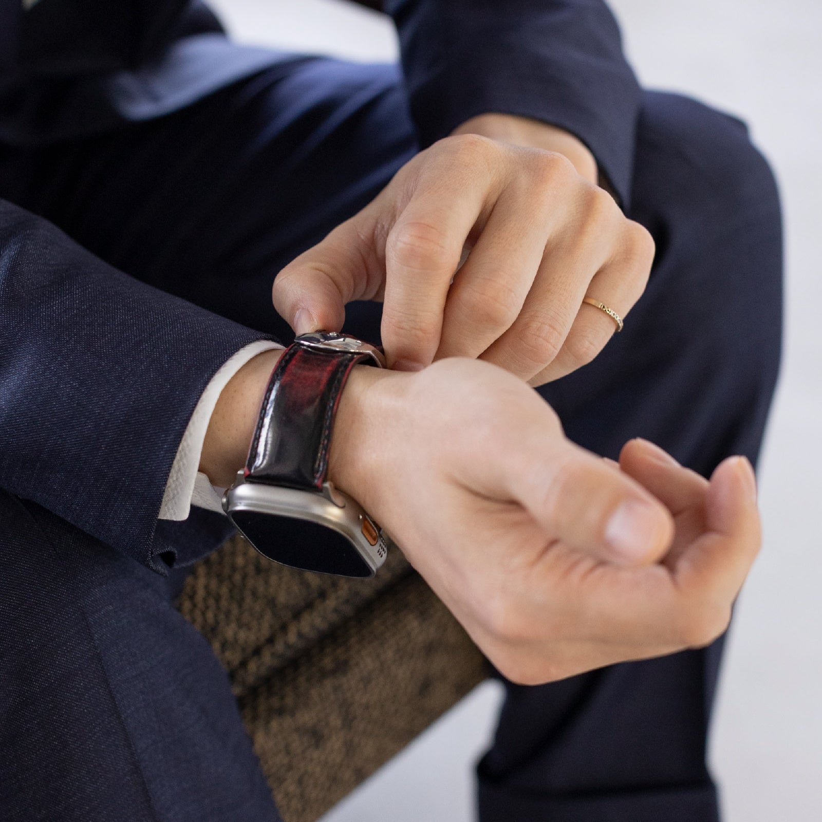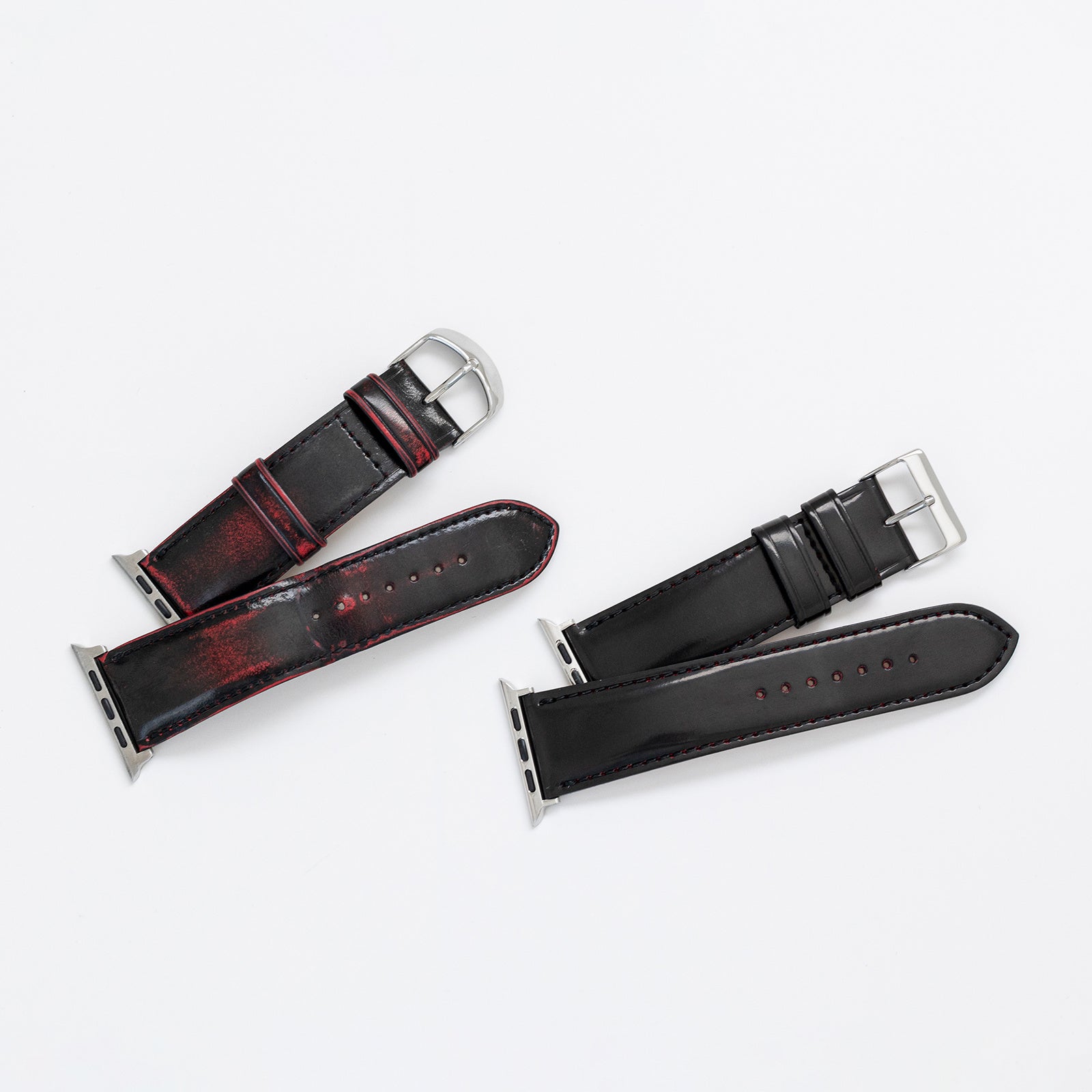 牛革表面に顔料を使って特殊加工した国内タンナーの革を使って仕上げたiPhone用ケース、Apple watch用バンド