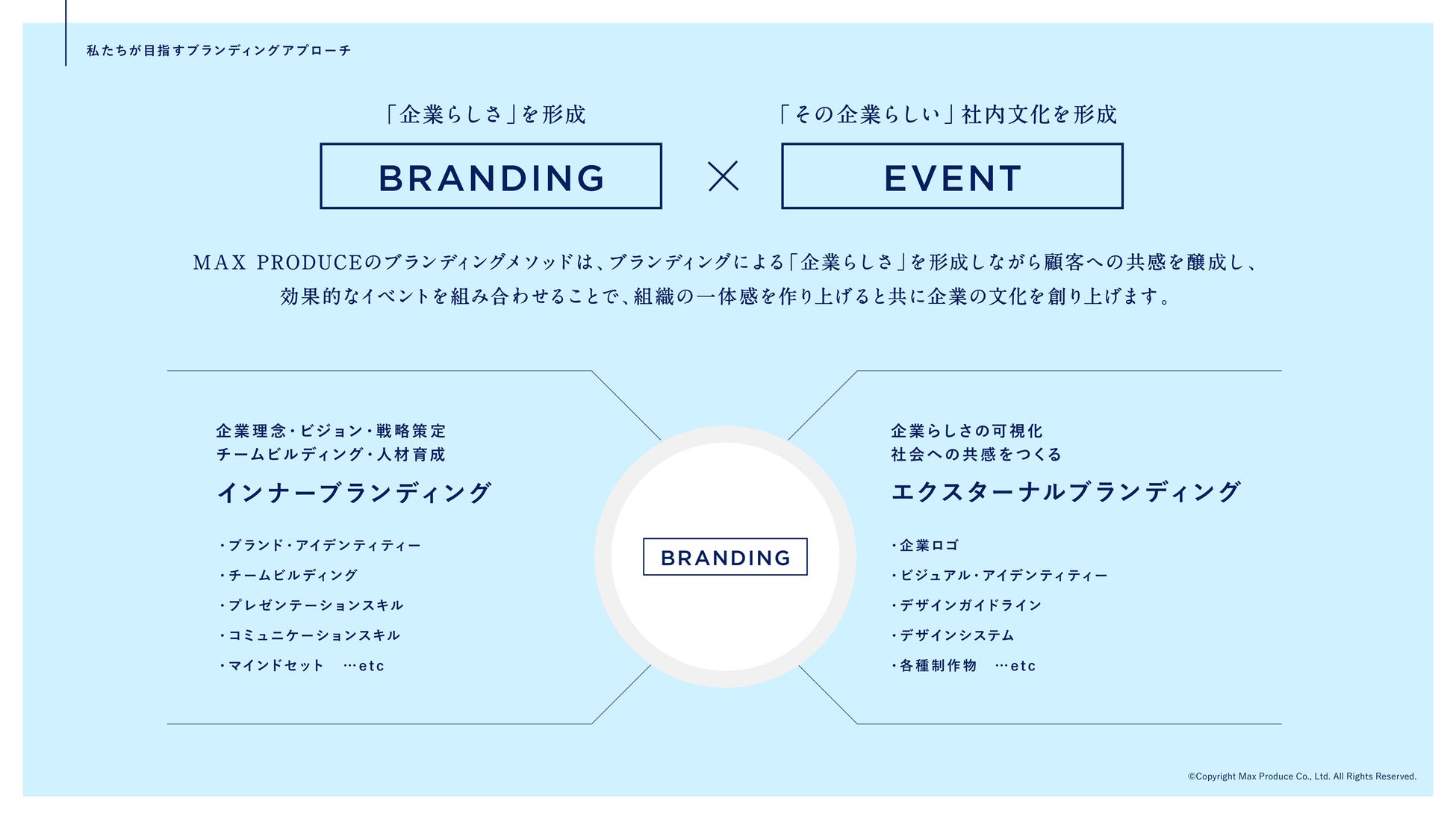 昨年からは、ブランディング事業を開始し、イベントだけではなくそこに向けた施策としての取り組みもクライアントに提供できるようにしております。また、イベント事業においても、ただイベントをプロデュースおよびディレクションするのみならず、ご登壇になる方のプレゼンテーション作成にも並走したりと当社が大事にしている「人間力」を合言葉にしながら、より経営陣と現場の思いをつないでいけるようにとも関わらせていただいております。