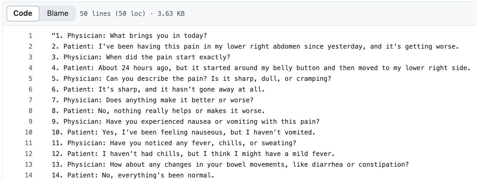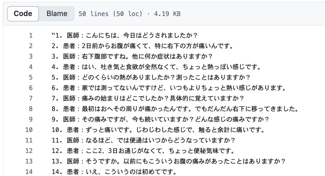 本サービスでは様々な疾患を持つ模擬症例を作成しています。Vignette(ビネット)では、模擬症例を医学的事項に沿ってまとめた構造化テキストとして提供しています。またその模擬症例に対応するDialogue(ダイアログ)では、模擬症例の訴えを医師が聴取する会話形式のテキストを提供しています。この2つは対になっており、一つの疾患で複数提供されています。