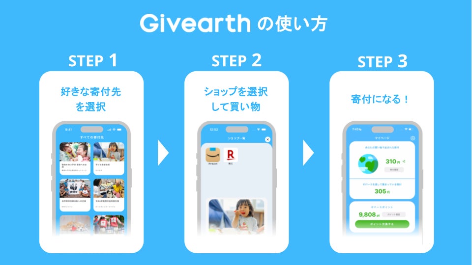ゼロ円寄付アプリ「Givearth(ギバース)」は、普段の買い物を追加負担ゼロで寄付に変える全く新しいサービスです。