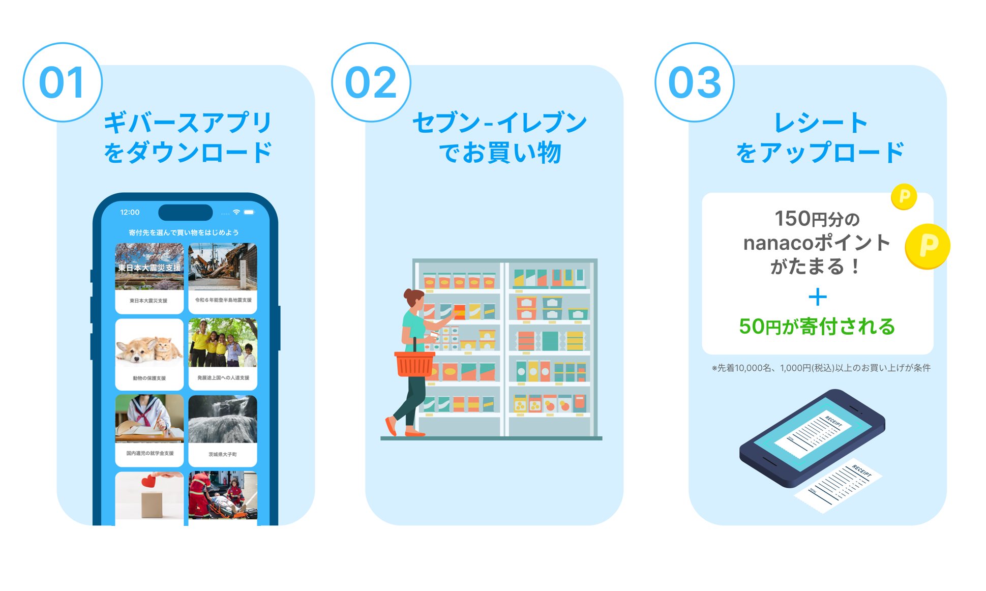 (1) セブン‐イレブンで1,000円以上の買い物を行う (2) 購入レシートを撮影してギバースのアプリ内から登録 |